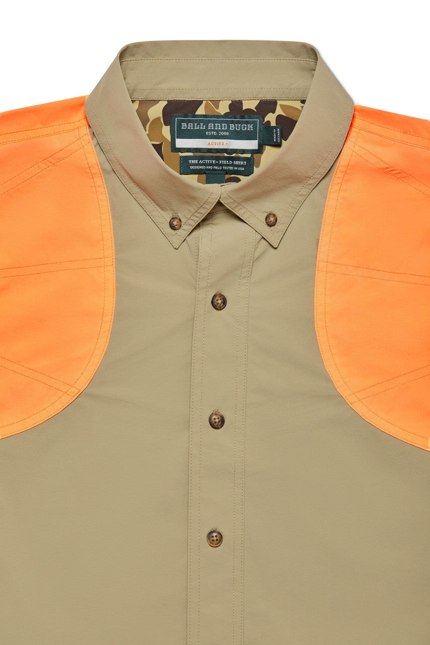 Our Active+ Field Shirt is a best seller that features our unique moisture-wicking poplin fabric that is cool-to-the-touch, four-way stretch, roll tab sleeves, and light in weight. Every Ball and Buck field shirt comes standard with hardwearing features like reinforced shooting shoulders with ShockEater® inserts, reinforced elbows, and our signature Tech Vent® underarm ventilation that allows for unparalleled mobility when raising your gun and keeps you cool for those hot days afield.