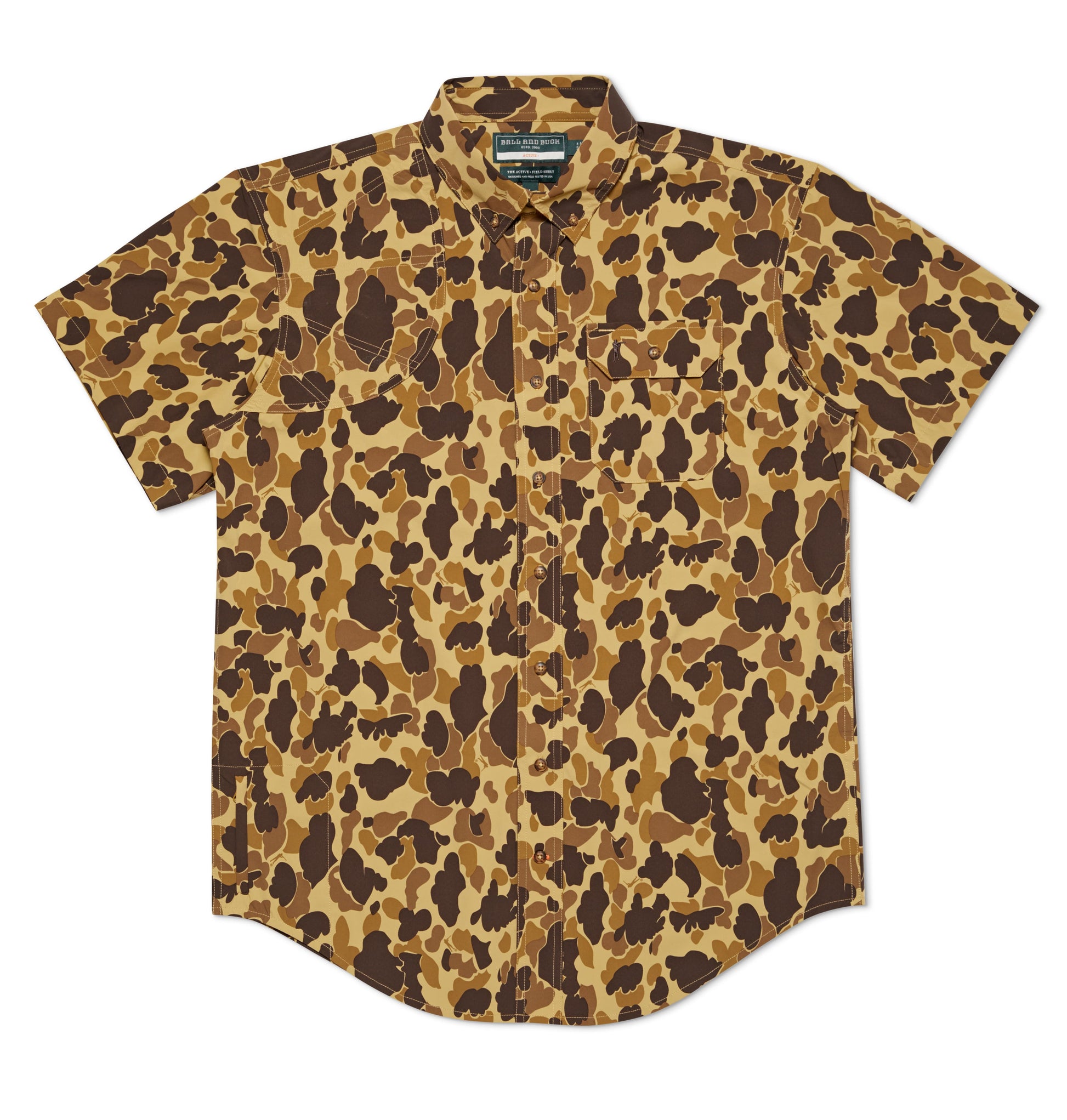 Our Active+ Camo Short Sleeve Field Shirt features our unique moisture-wicking poplin fabric that is cool-to-the-touch, four-way stretch, and light in weight. Every Ball and Buck field shirt comes standard with hardwearing features like reinforced shooting shoulders with ShockEater® inserts and our signature Tech Vent® underarm ventilation that allows for unparalleled mobility when raising your gun and keeps you cool for those hot days afield.