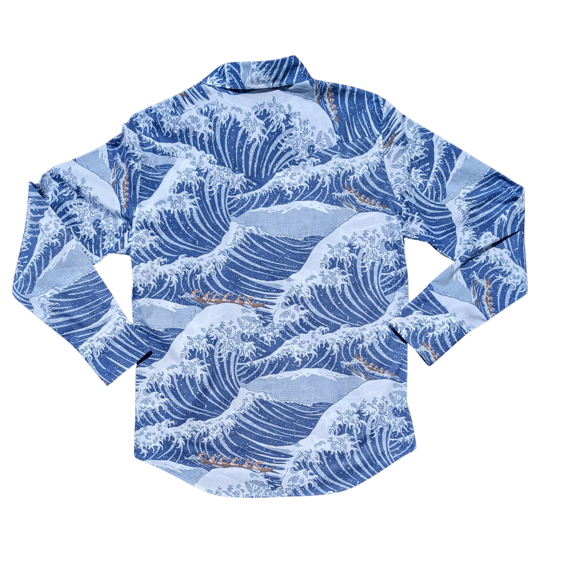 Inspired by the woodblock prints of Japanese artist Katsushika Hokusai (1760-1849), Alenuihaha tells the story of the Big Island outrigger canoe paddlers brave or foolhardy enough to attempt the Alenuihaha Channel, one of the most dangerous stretches of water on earth. The brighter colors of our short sleeve version of this print are replaced by Winter's darker blues and navy, just like the water on a stormy day.