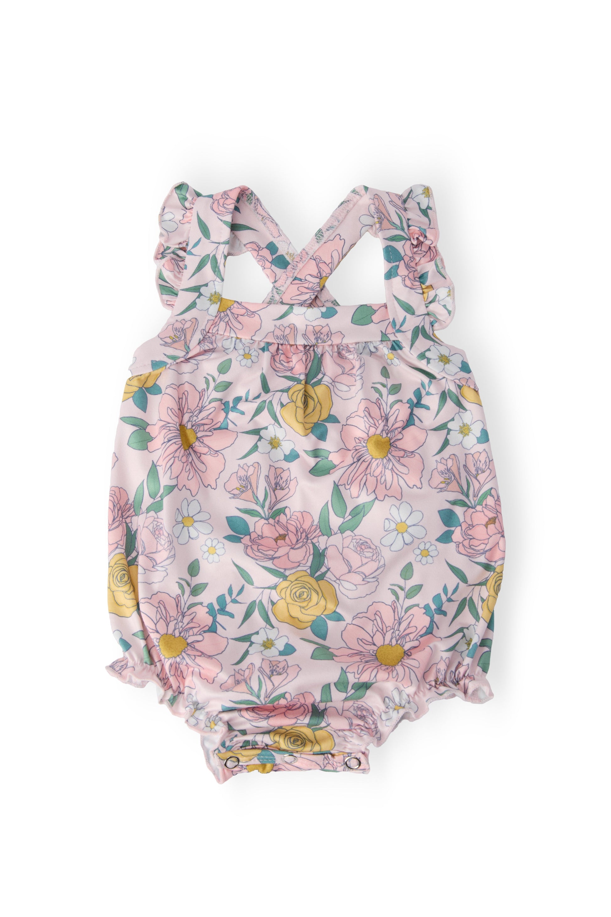 Our Ruffle Cross Back Romper is perfect for summer! Straps criss cross in the back with a sweet ruffle on the shoulder. Snaps for easy diaper changes.