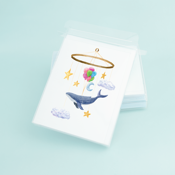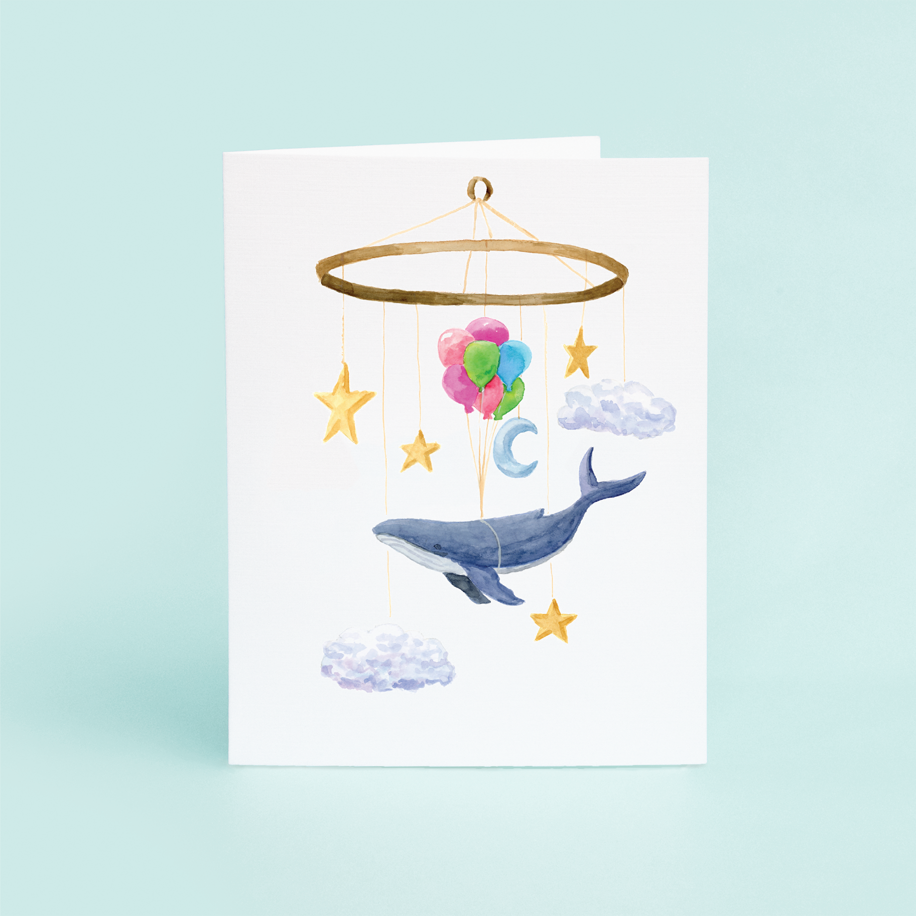 Celebrate the joy of a new arrival with our charming greeting card adorned with a watercolor baby mobile. Perfect for baby showers, welcoming a new baby home, or sharing in a gender reveal celebration, this original artwork captures the sweetness and excitement of infancy. Share your warm wishes and anticipation for the little one with this adorable design from Taylor Paladino, ideal for expressing love and happiness during this special time.