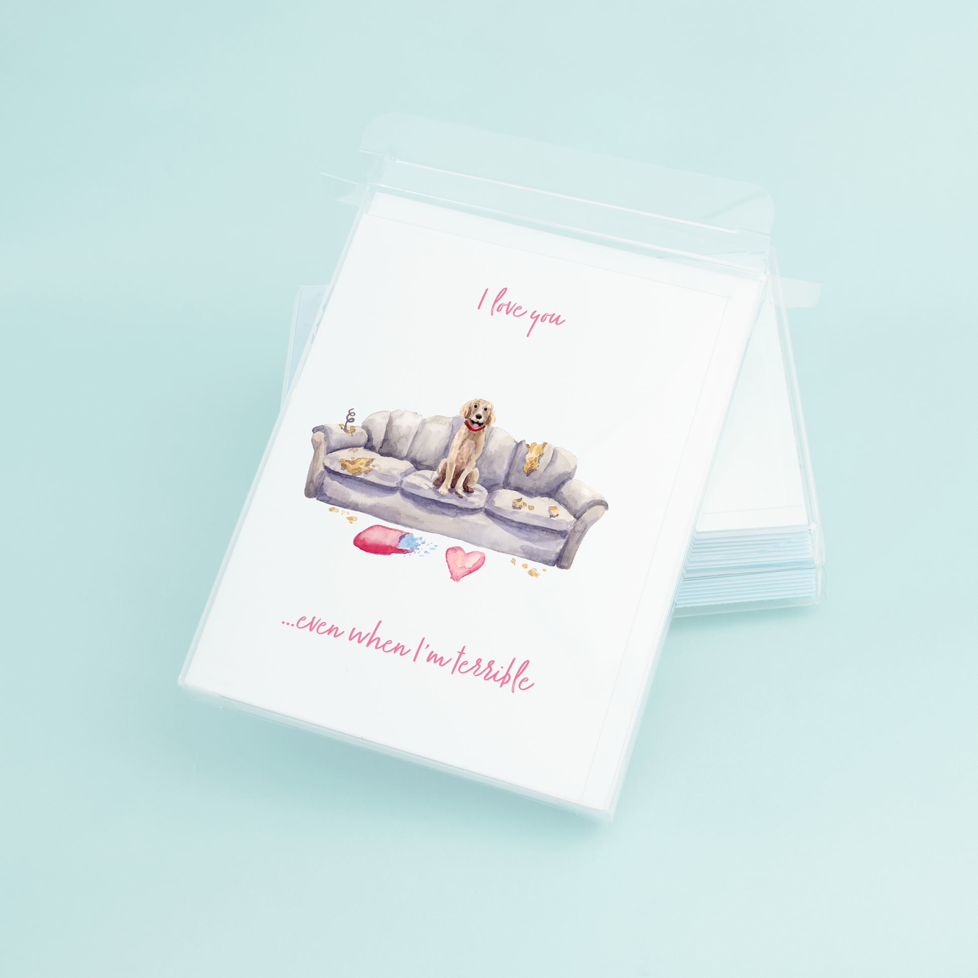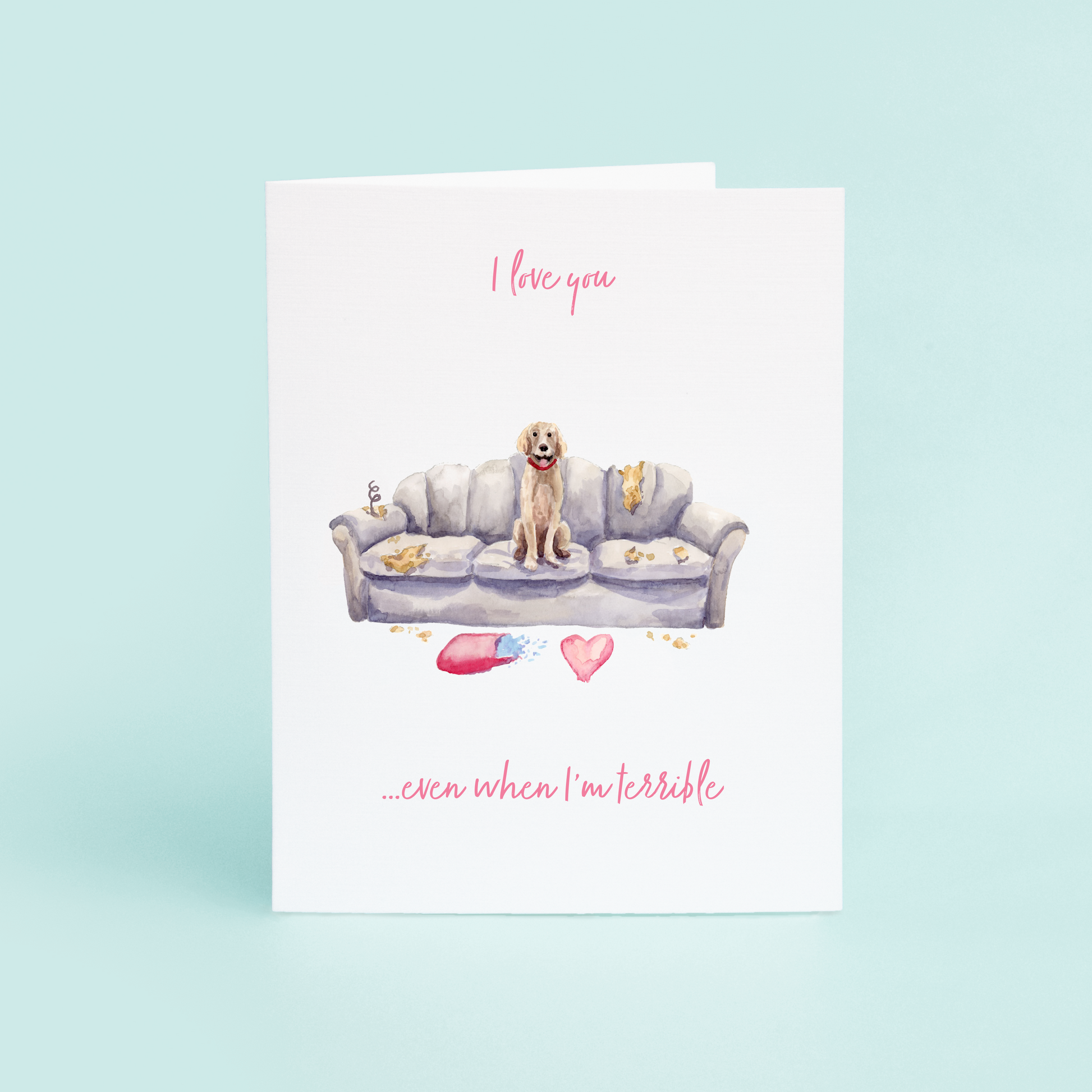 Celebrate the playful mischief of our greeting card featuring a watercolor dog on a torn-up couch. The card humorously reads, "I love you even when I'm terrible." Perfect for dog lovers and anyone who cherishes the antics of their furry companions, this original artwork captures the unconditional love and humor in pet ownership. Share a smile and a heartfelt message with this whimsical design from Taylor Paladino, ideal for sending apologies or simply brightening someone's day with a dose of canine charm.