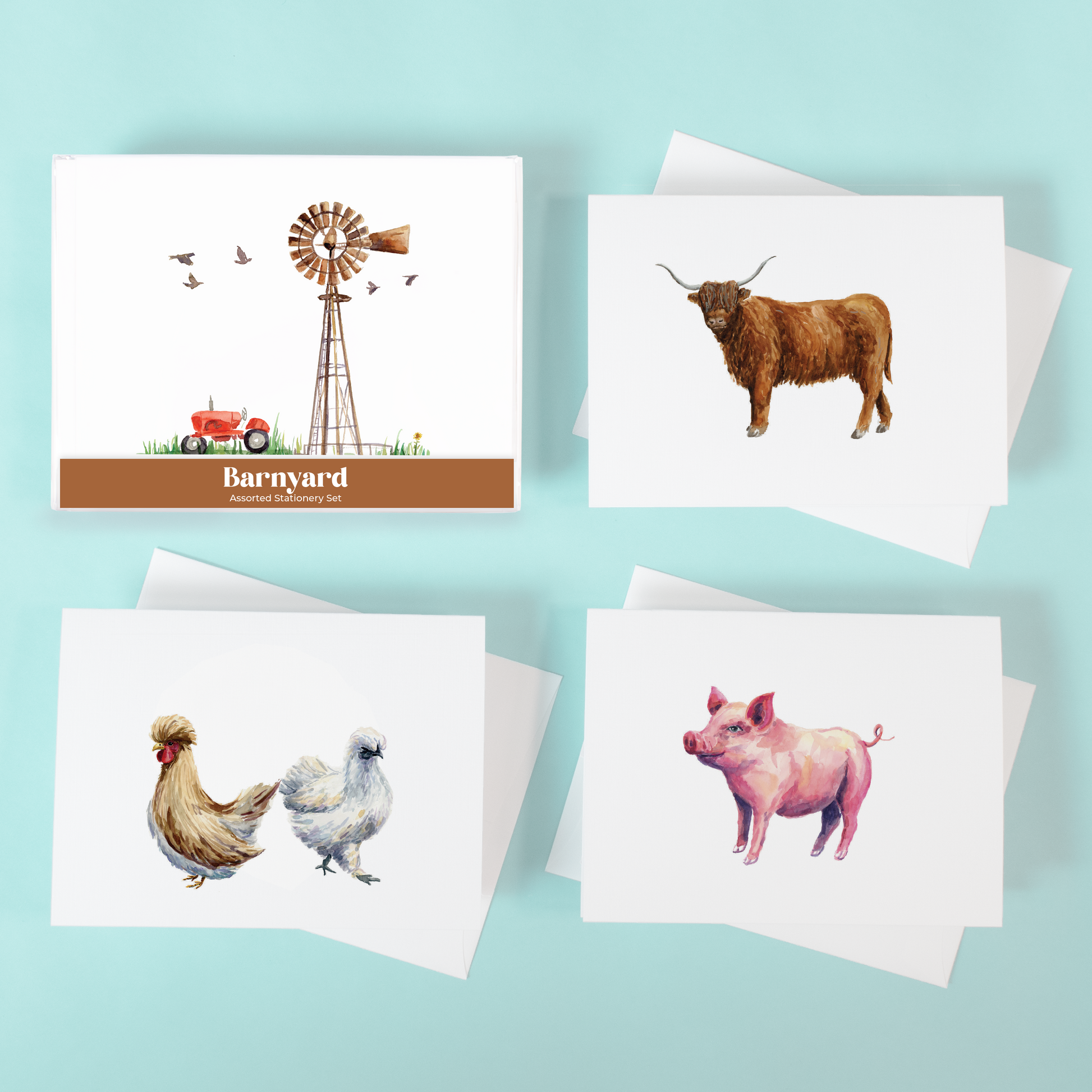 Discover the rustic charm of our Barnyard Assorted Stationery Set, featuring exquisite watercolor art of a highland cow, pig, windmill, and chickens on each card. Perfect for sending warm greetings or adding a touch of countryside beauty to your correspondence, this set captures the essence of farm life with every detail. Share the joy of handwritten notes with this unique collection from Taylor Paladino, ideal for animal lovers and those who appreciate the simplicity and serenity of rural landscapes.