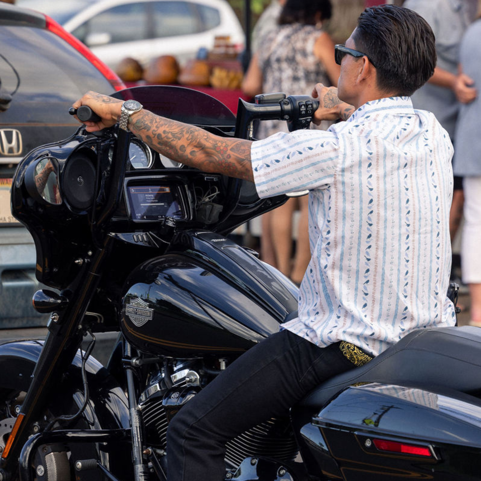 Birds and Lei is an original print featuring stripes of colorful flower lei and some of our favorite native birds, the akohekohe, anianiau, and apapane.