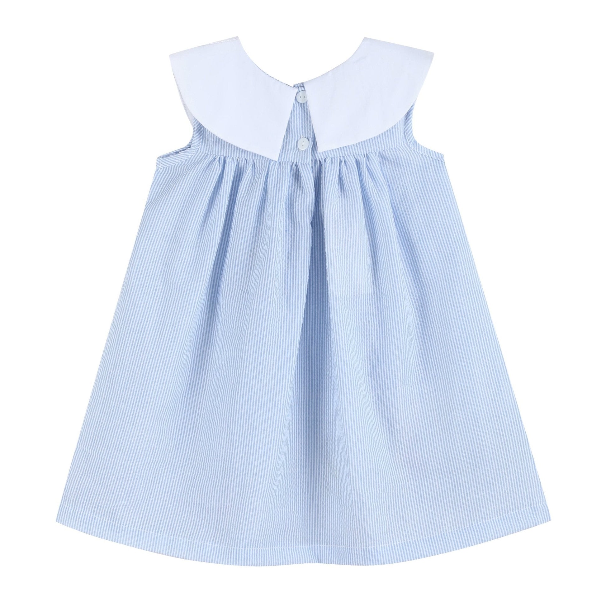 Classic charm meets springtime sweetness in our Blue Bunnies Seersucker Yoke Dress. Made from soft, breathable cotton, this darling dress features a crisp white collar for a timeless look. Along the hem, three adorable appliqué bunnies add a playful touch—perfect for Easter, spring photos, or any sunny day. Let her make sweet memories in this darling outfit!