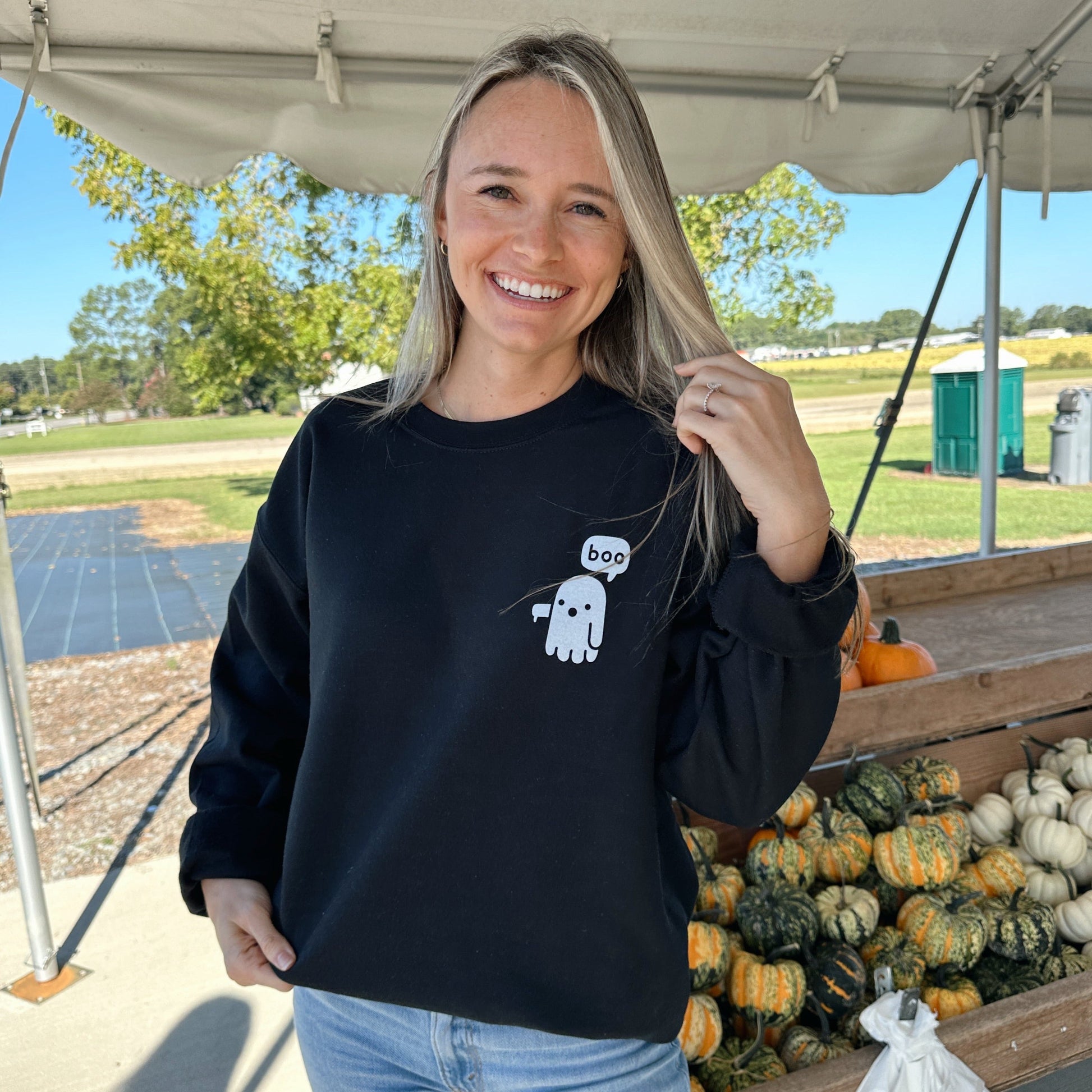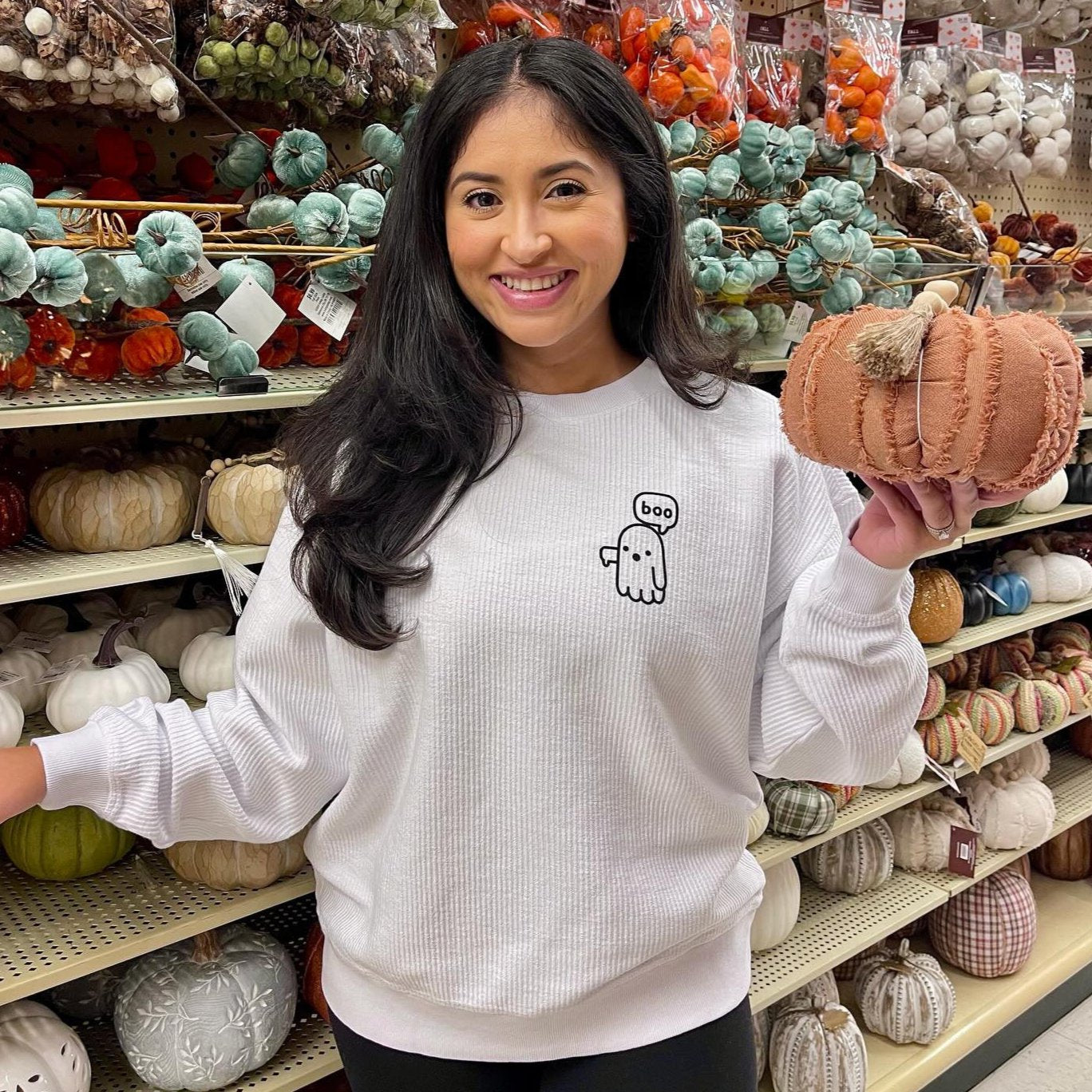 Model is wearing a small white oversized corded crew. Other model is wearing a medium black sweatshirt.
