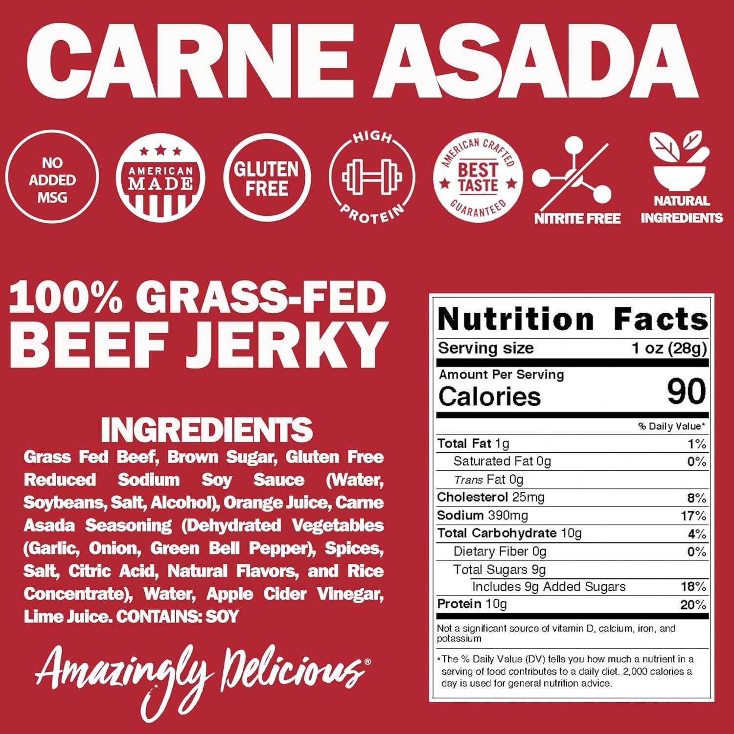 Carne Asada: Satisfy your cravings with our premium meat marinated in orange, garlic, onion, green bell peppers, and a splash of lime; keep yourself fueled with the balanced, bold flavor of our healthy snacks.
