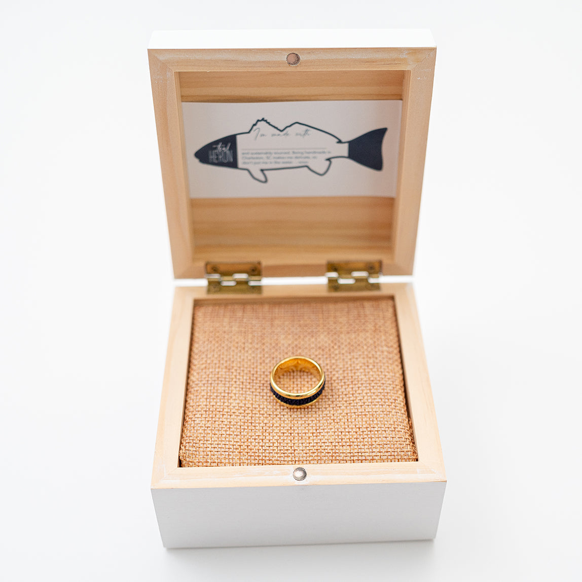 Indulge in the exquisite beauty and timeless style of Catawba Ring. Made with genuine fish or stingray leather that wraps around the entire band, this ring boasts a seamless and unique design. Perfect for your special wedding day band.
