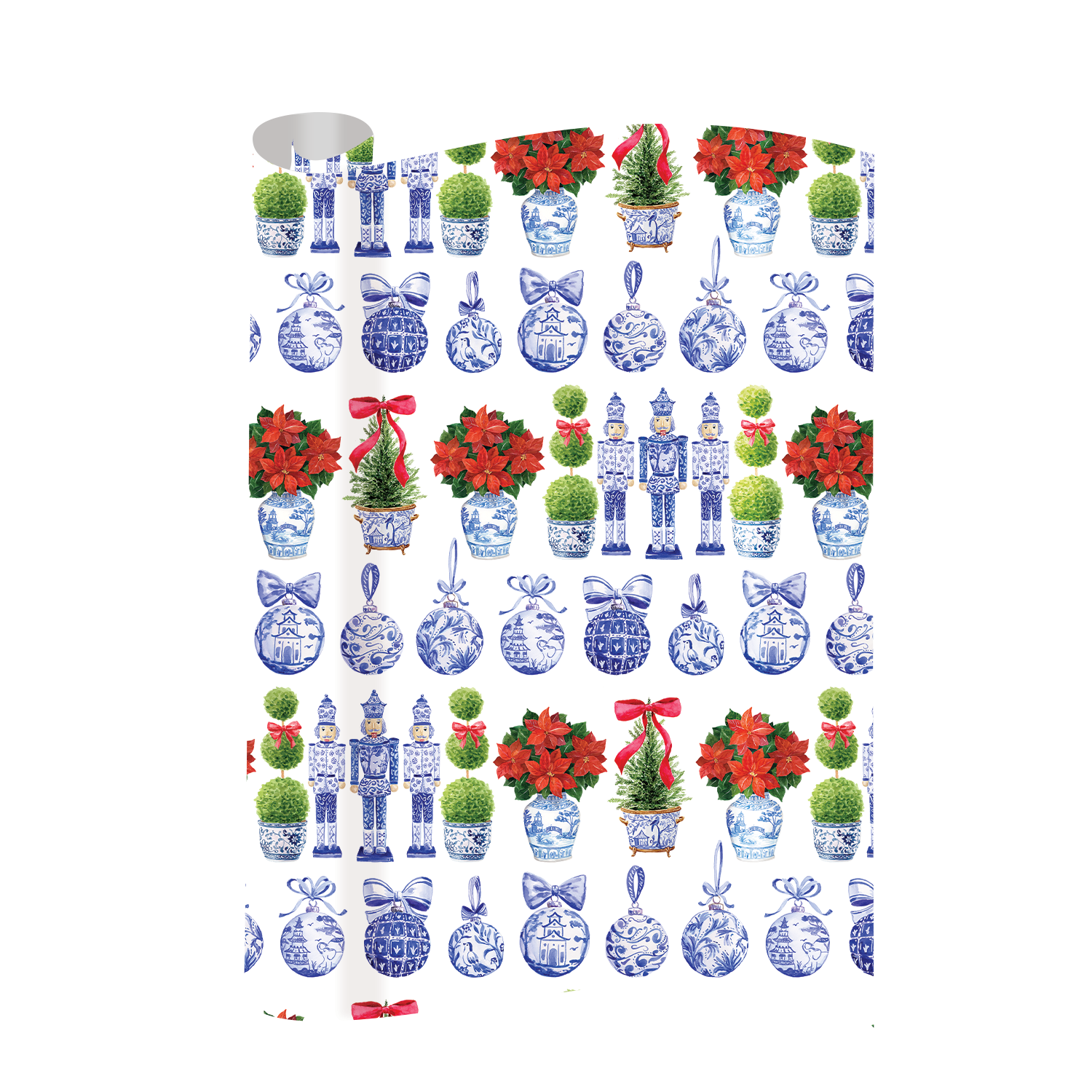 Chinoiserie Christmas Gift Wrap showcases elegant nutcrackers, ginger jars, potted trees, and poinsettias in a refined design. This stunning wrapping paper adds a sophisticated and timeless touch to your holiday gifts, perfect for those who appreciate classic style with an artistic flair.