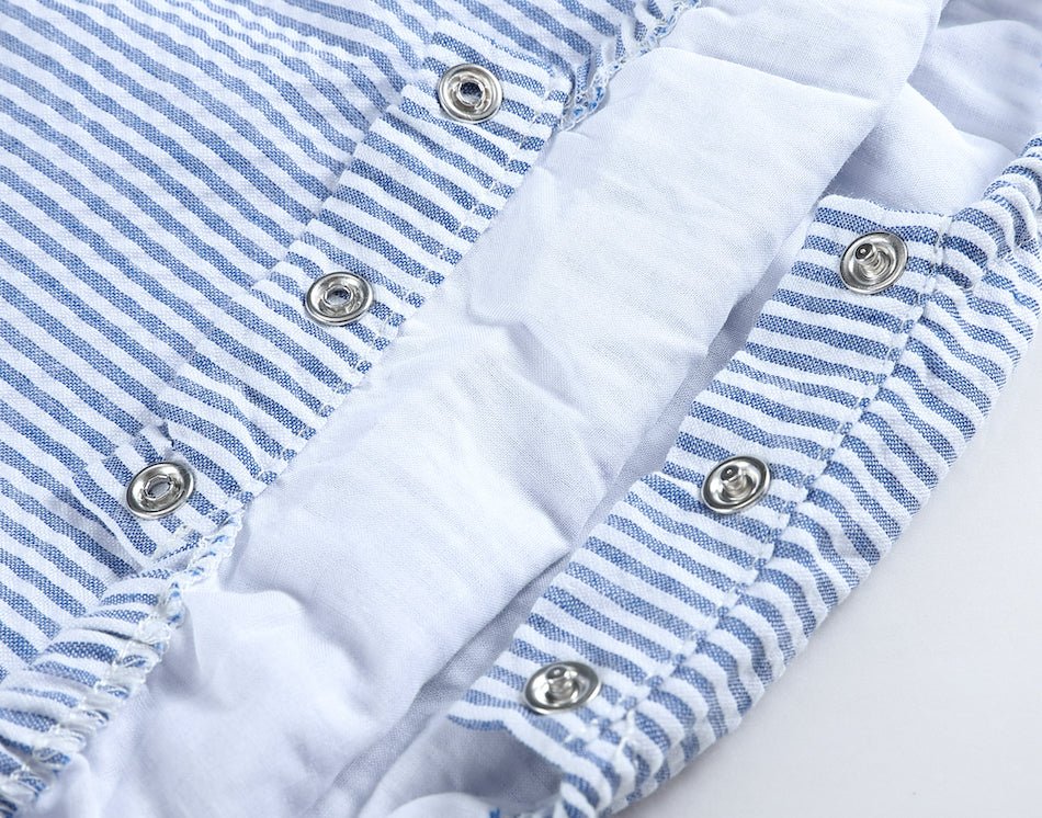 This adorable dark blue seersucker romper is soft, cool and easy to care for. Perfect to wear as is or ready for your embroidery or monogram with its blank front panel. The snaps make it easy for a quick change which is great for you and your cutie.