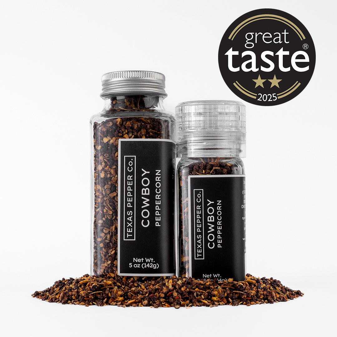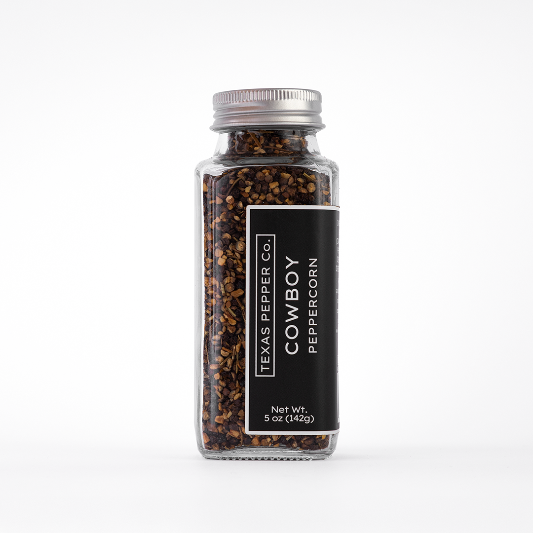 Smoke up your next meal with Cowboy Peppercorn! Our all-natural blend pepper is made with cracked black peppercorn, dried garlic, and dried rosemary for an intense, smoky flavor. Includes a convenient grinder for a perfect finish every time. Give your taste buds something to talk about!