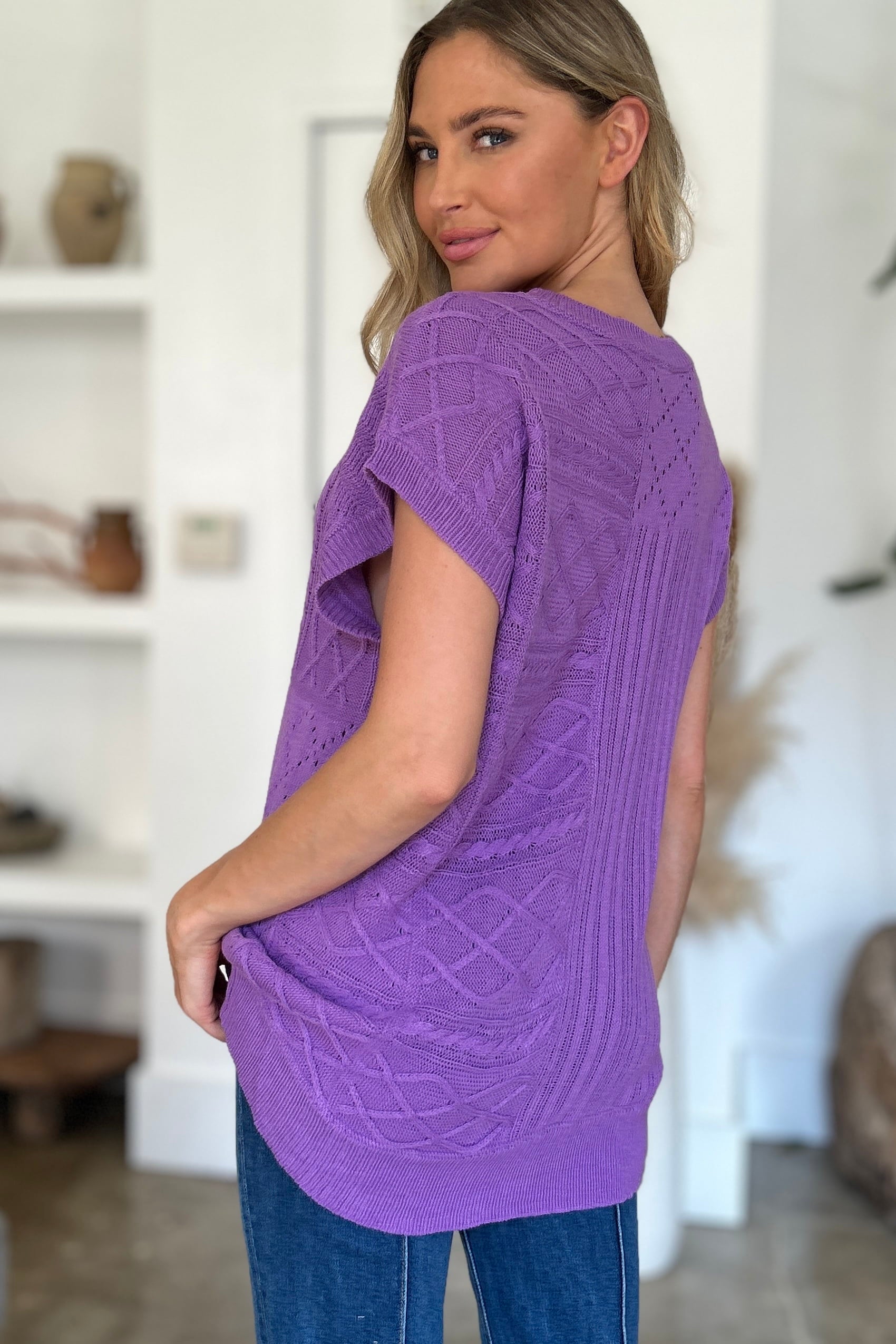 Double Take Full Size Cable-Knit Round Neck Cap Sleeve Sweater
