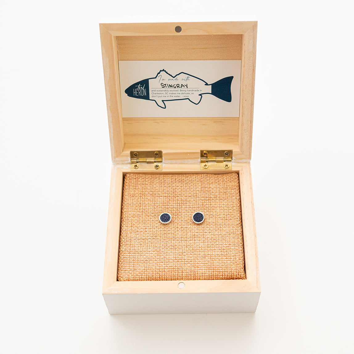 Experience unparalleled elegance and sophistication with the Edisto earrings crafted from premium fish leather. Let the unique patterns and colors captivate you, while a touch of edgy allure adds a bold and enchanting twist to your look. Stud size: 3/8" diameter.