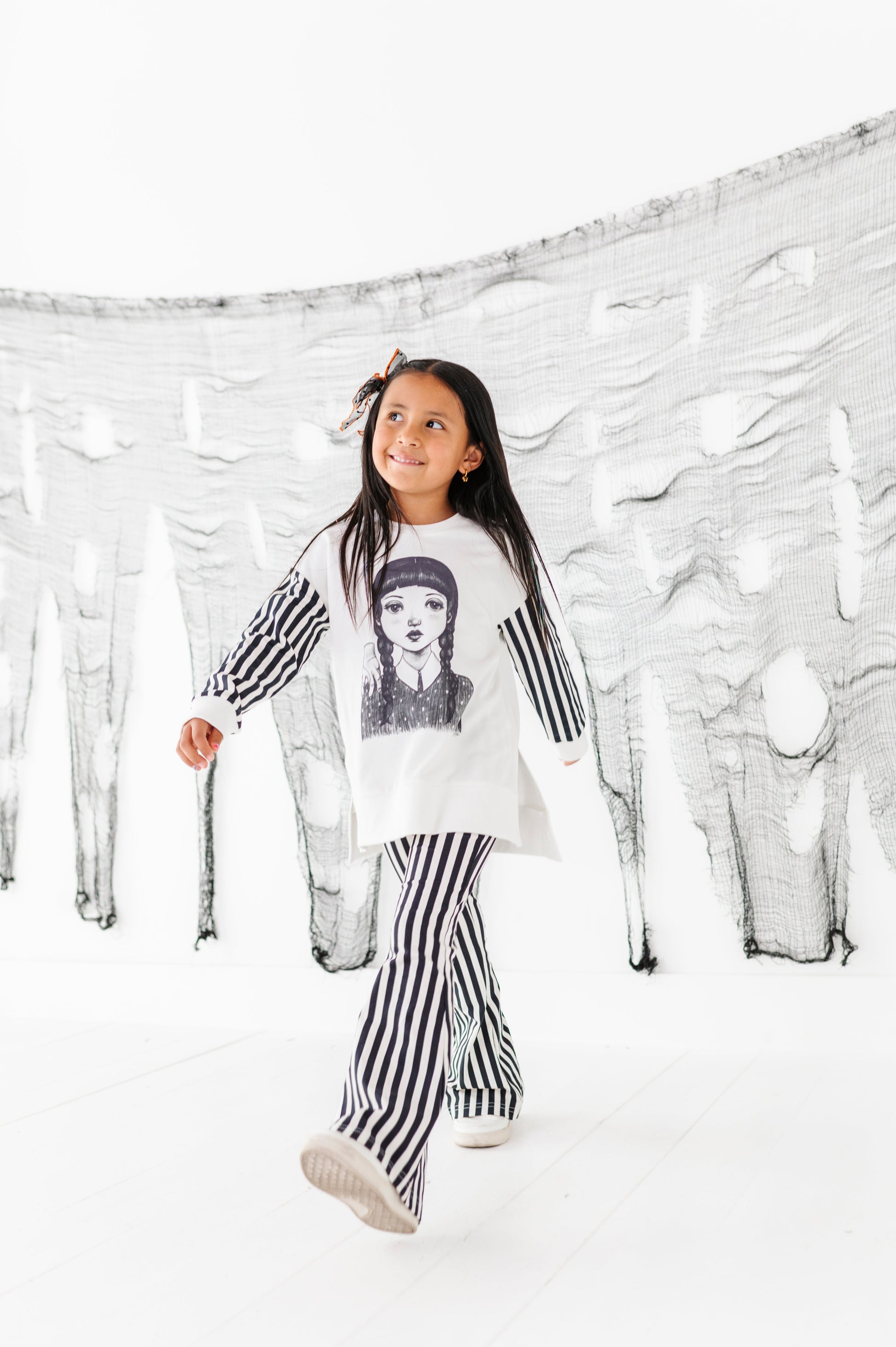 This item runs true to size. These are made to fit snug in the waist/hips and top of legs and then flare at the knee down. If you have a girl with long legs we recommend ordering the size she needs for pant length! If you have a shorter girl we don't recommend sizing up because you don't want flares to drag on the floor :)