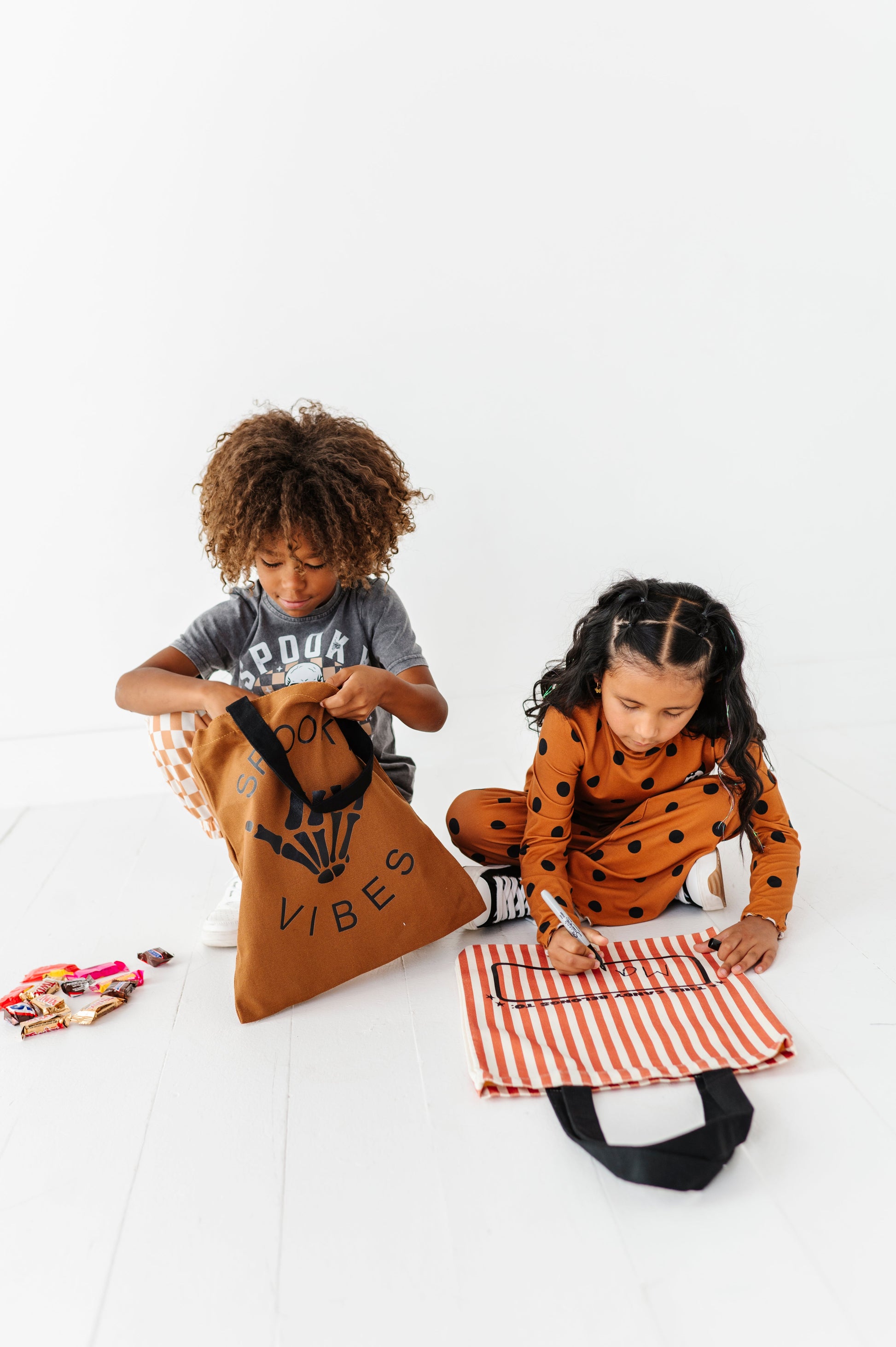 Our NEW and improved trick-or-treat bags are back! These were such a hit last year and are the most fun (and cute) way to trick-or-treat this Halloween! Each bag comes with a sharpie marker to write your child's name on the name tag on the back! This is such a fun activity for your kids to be able to "claim their candy" :) BAGS MEASURE 40X35 CM WITH HANDLES THAT DROP DOWN 10.5''
