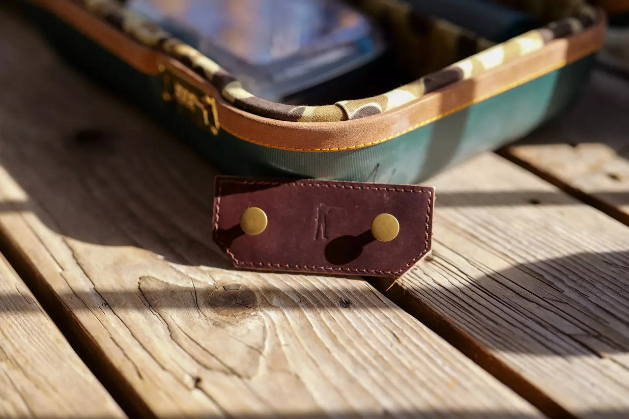 Introducing the Fly Patch – your ultimate fishing companion. With our innovative Versa patch system, easily attach it to your active shirt or jacket for hassle-free access. Crafted from self-healing silicon material, it bounces back after each use. The full-grain leather back, adorned with brass studded buttons and blaze orange stitching, adds a touch of style. With over a 30 fly capacity, it's perfect for any fishing condition. High quality, long-lasting, and versatile – it's time to hit the river in style. A must-have for avid fly fishermen who always wants to be ready to cast a line at a moment's notice.