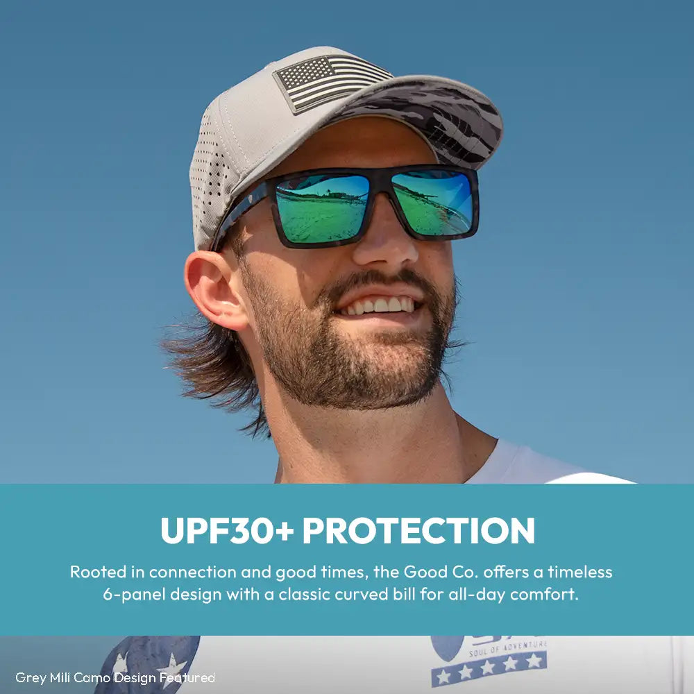 Rooted in connection and good times, the Good Co. offers a timeless 6-panel design with a classic curved bill for all-day comfort. Water-repellent, laser-perforated sides, and a moisture-wicking sweatband keep you cool, dry, and moving freely.