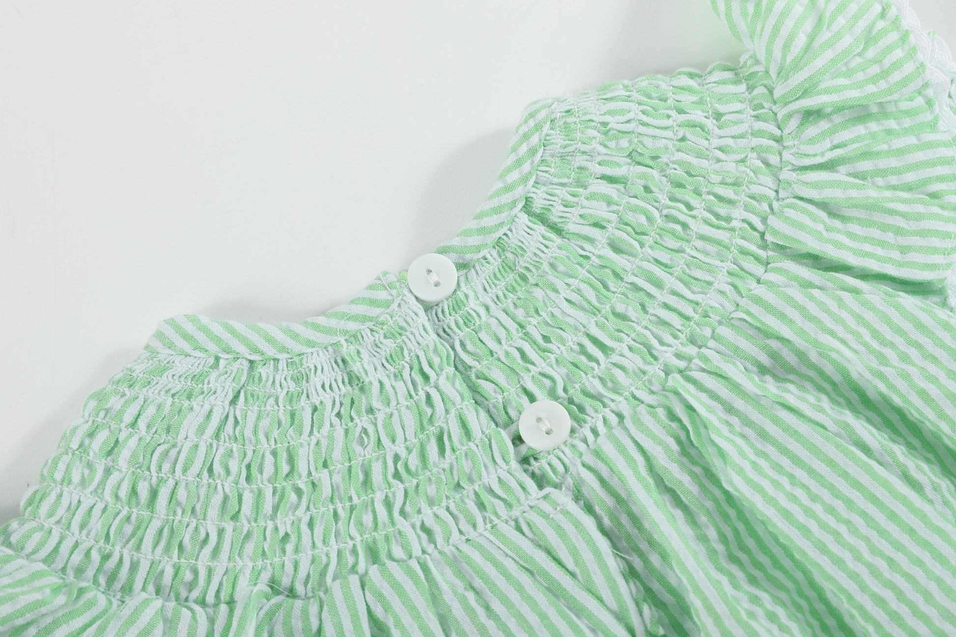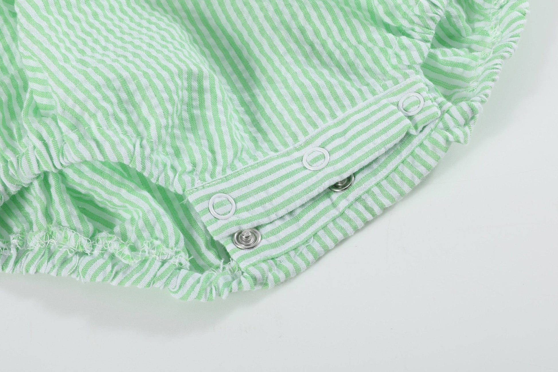 The Green Seersucker Easter Bunny Smocked Flutter Romper is perfect for your little girl's Easter celebration! Made from a pretty green seersucker cotton, it features a smocked neckline with adorable embroidered bunnies topped with fluffy pompom tails. Snaps allow for easy diaper changes. This charming romper is ideal for Easter egg hunts, family gatherings, and all her springtime adventures!
