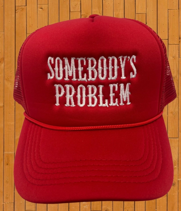 Lend your head some attitude with this Somebody's Problem Red embroidered trucker hat. Stand out from the crowd with its bold red color and quirky embroidered message. Perfect for adding a touch of humor to any outfit.