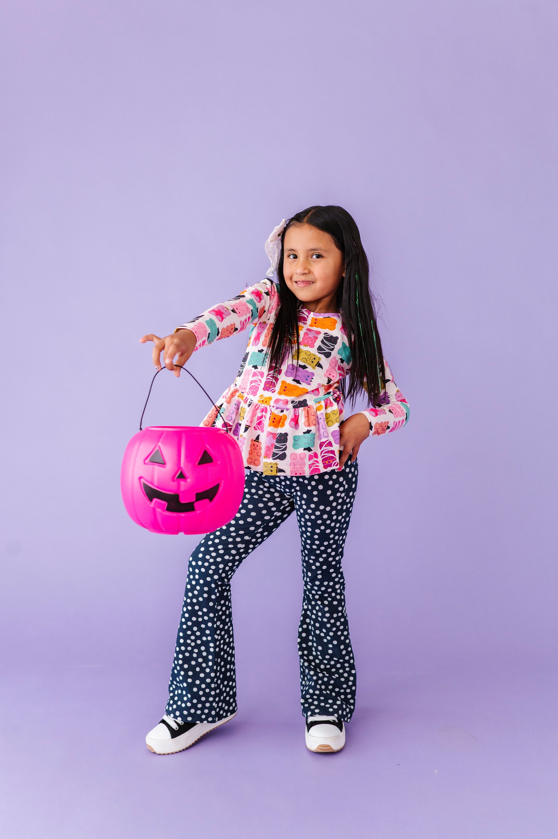 This item runs true to size. These are made to fit snug in the waist/hips and top of legs and then flare at the knee down. If you have a girl with long legs we recommend ordering the size she needs for pant length! If you have a shorter girl we don't recommend sizing up because you don't want flares to drag on the floor :)