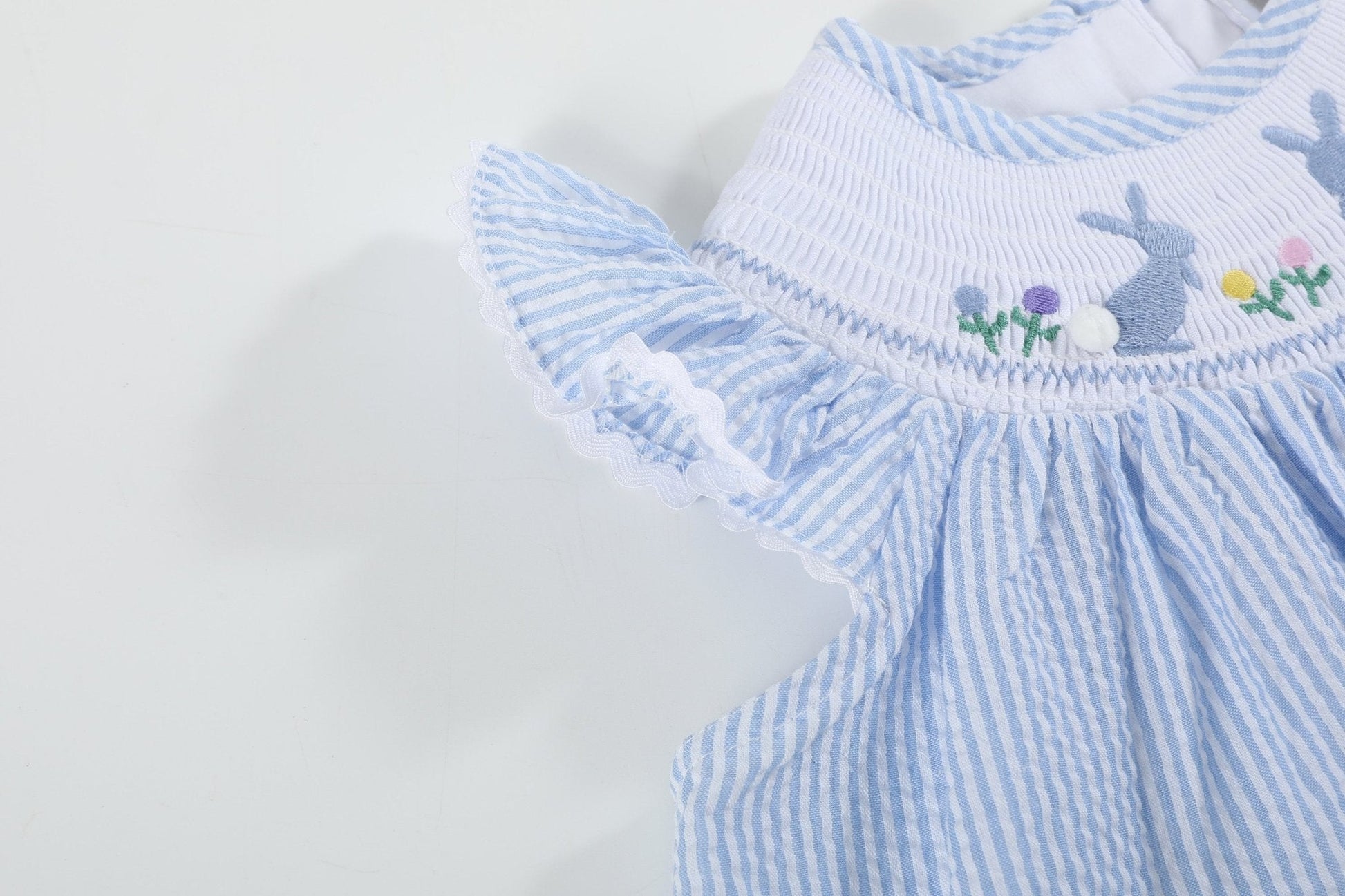 The Light Blue Seersucker Easter Bunny Smocked Bishop Dress is a delightful springtime treasure for your little girl! Crafted from enchanting light blue seersucker, it features a beautifully smocked neckline adorned with embroidered bunnies, each with an adorable pom-pom tail. Sweet rickrack trim adds a playful touch, making this dress perfect for Easter egg hunts, family gatherings, or festive photos. Soft, stylish, and charming, it’s sure to make her Easter "hoppy" and unforgettable!