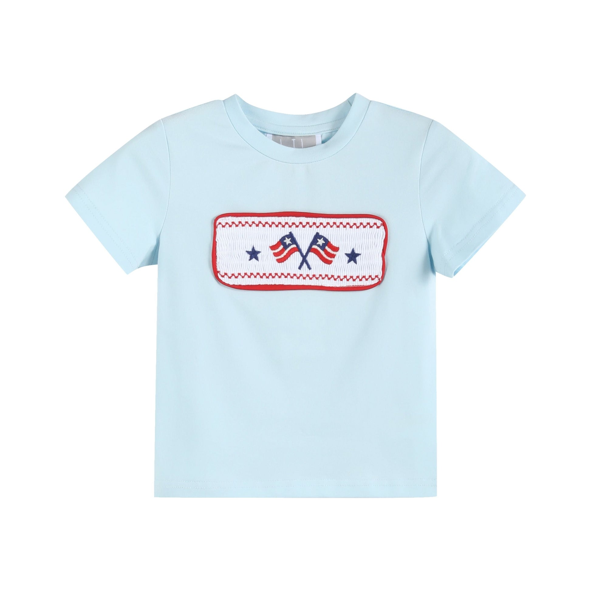 Celebrate in patriotic style with our Light Blue USA Flag Smocked T-Shirt and Shorts Set! This all-American outfit features a light blue short-sleeve t-shirt with a smocked panel proudly displaying embroidered American flags—perfect for Memorial Day, the 4th of July, or any red, white, and blue occasion. The coordinating shorts complete the look with an easy, comfortable fit thanks to their elastic waistband.