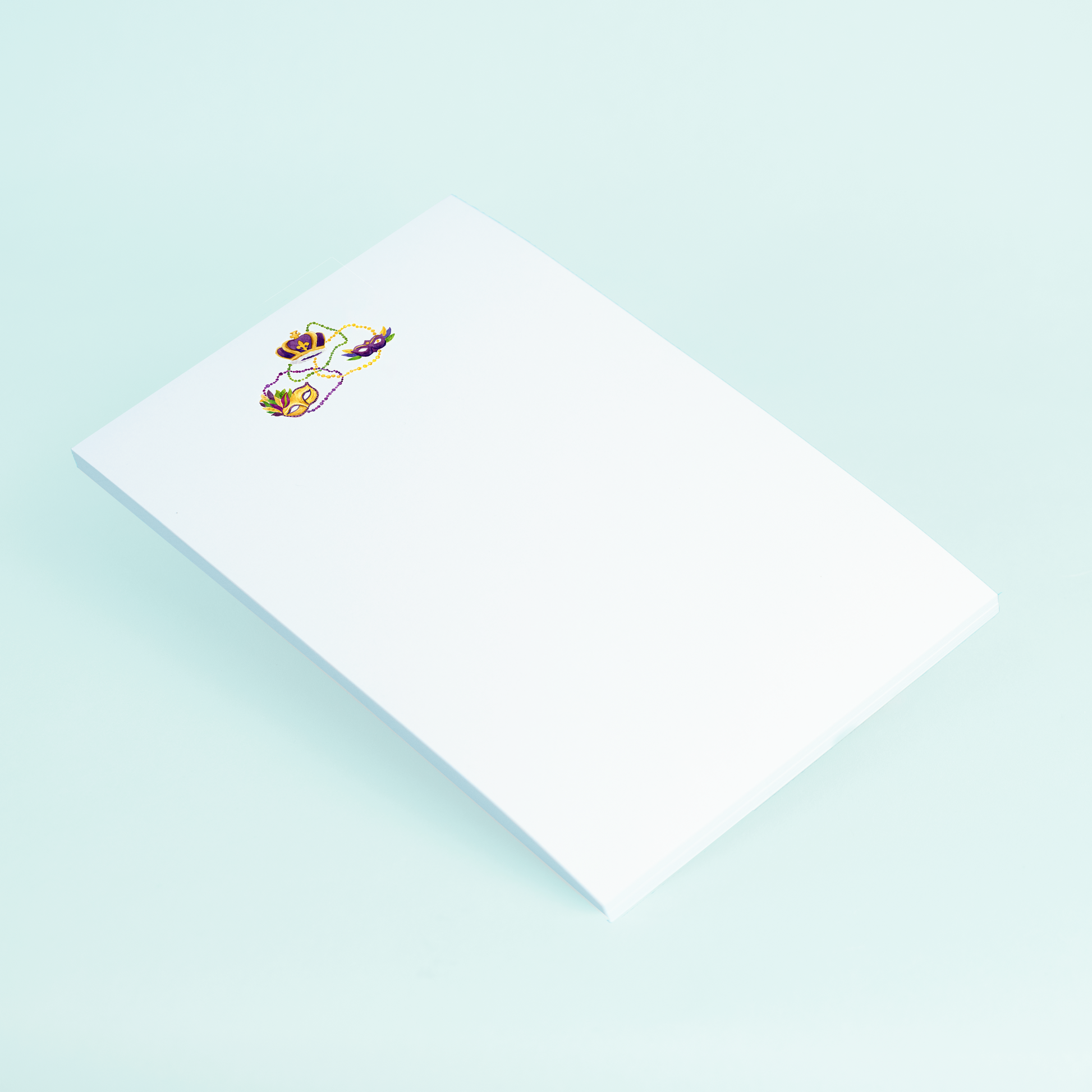 Introducing the vibrant 4 x 6 notepad featuring the original watercolor art of Dallas-based artist Taylor Paladino. Each of the 50 pages of this notepad showcases colorful masks and a crown interspersed with colorful beads, capturing the festive spirit of Mardi Gras in a stunning and unique way.