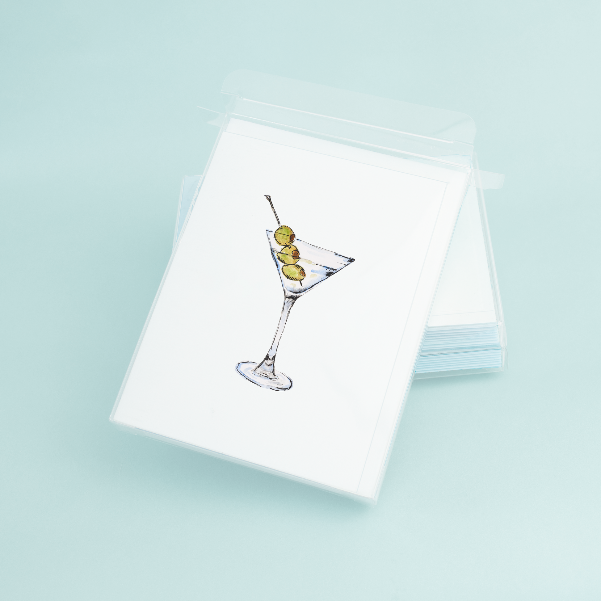 Introducing the elegant A2 greeting card featuring the original watercolor art of Dallas-based artist Taylor Paladino. This card showcases a classic martini with olives on the front, rendered in stunning detail and printed on luxurious linen cardstock.