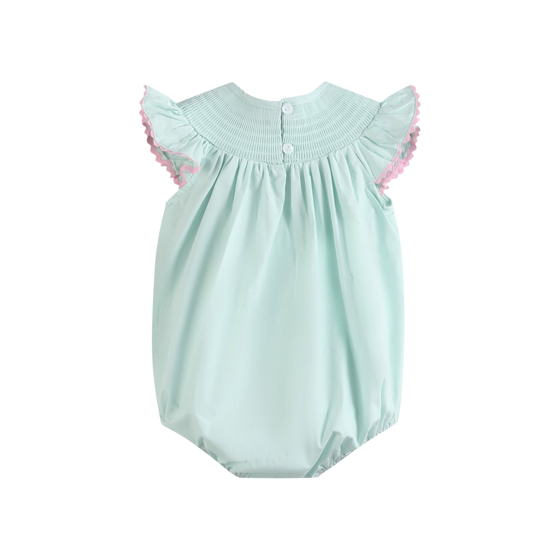 Celebrate Easter in style with the Misty Blue Easter Bunny Smocked Bubble Romper. Crafted from 100% soft, breathable cotton, this sweet romper features delicate smocking and embroidered Easter bunnies at the neckline. The classic bubble silhouette provides a comfortable fit, while snap closures make diaper changes quick and easy. Perfect for Easter gatherings, photos, and sunny spring days, this romper brings timeless charm and festive fun to your little one’s wardrobe.