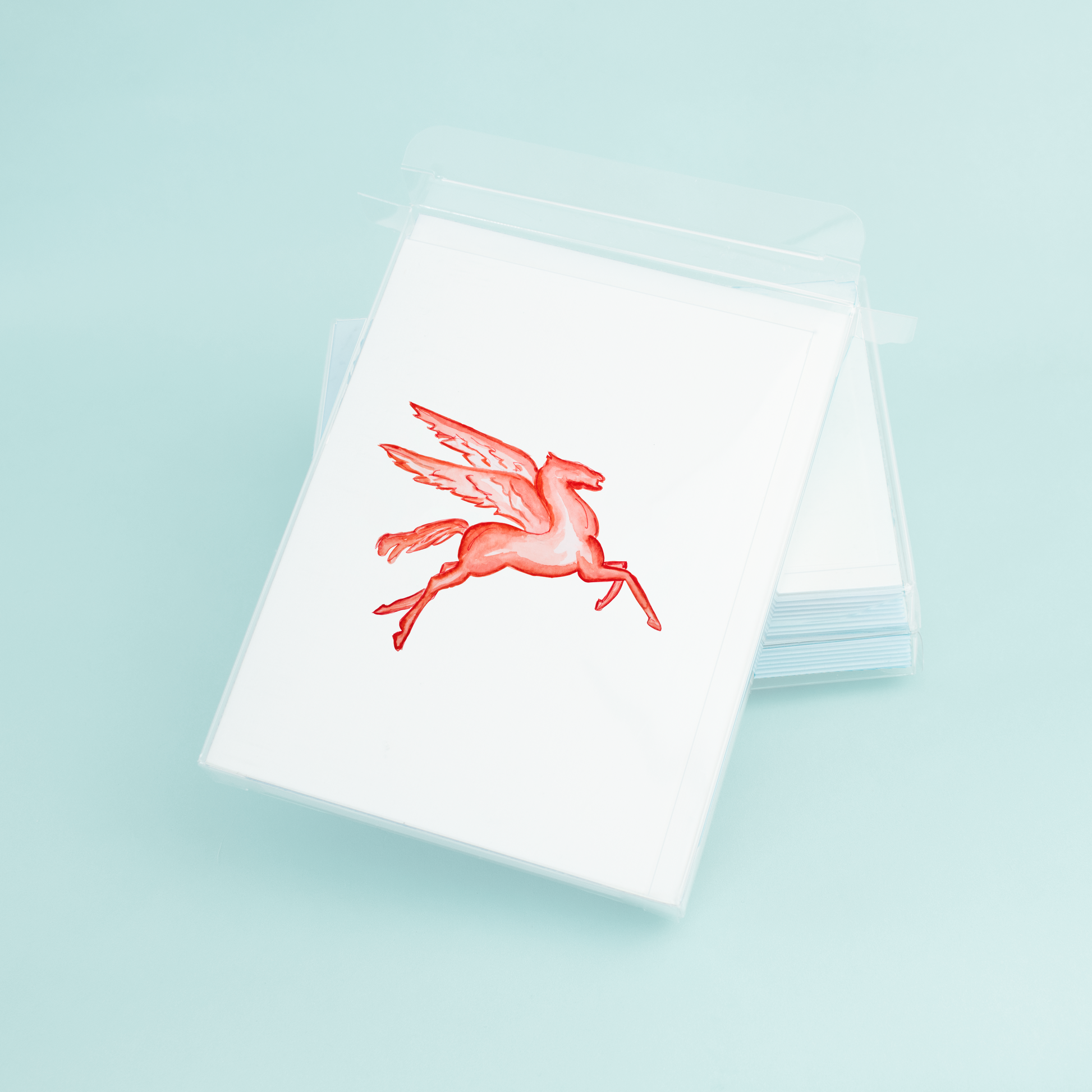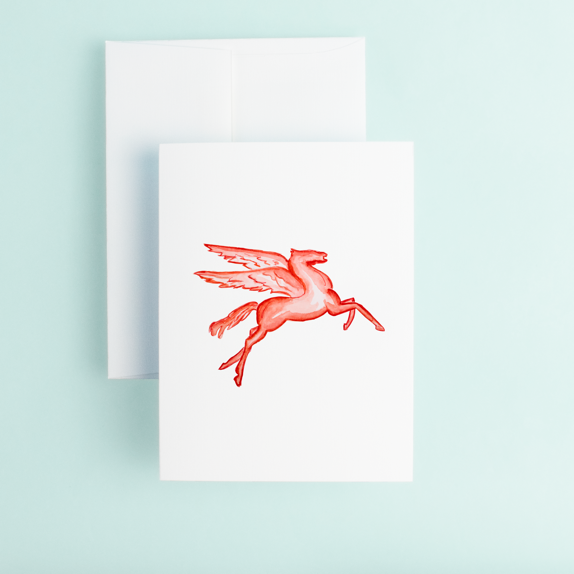 The use of watercolors gives the Pegasus a lifelike quality, with each element of the design carefully and thoughtfully depicted to capture the beauty and spirit of the iconic logo. The red colors of the Pegasus add a touch of vibrancy and energy to the card, making it the perfect choice for any occasion.