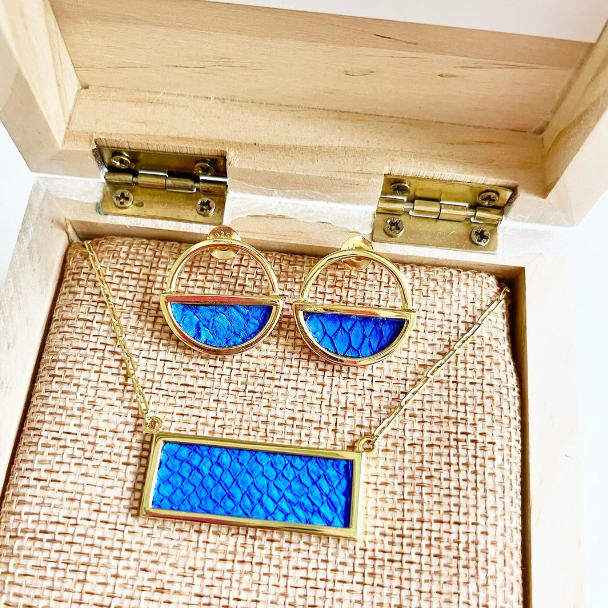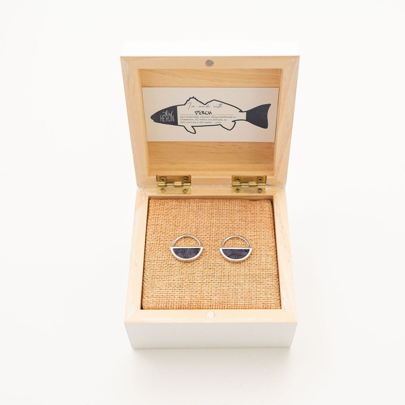 The Nantahala Earring bodes a circular design adorned with vibrant, colorful fish leather that seamlessly merges elegance with individuality. Earring Length: 7/8" long.