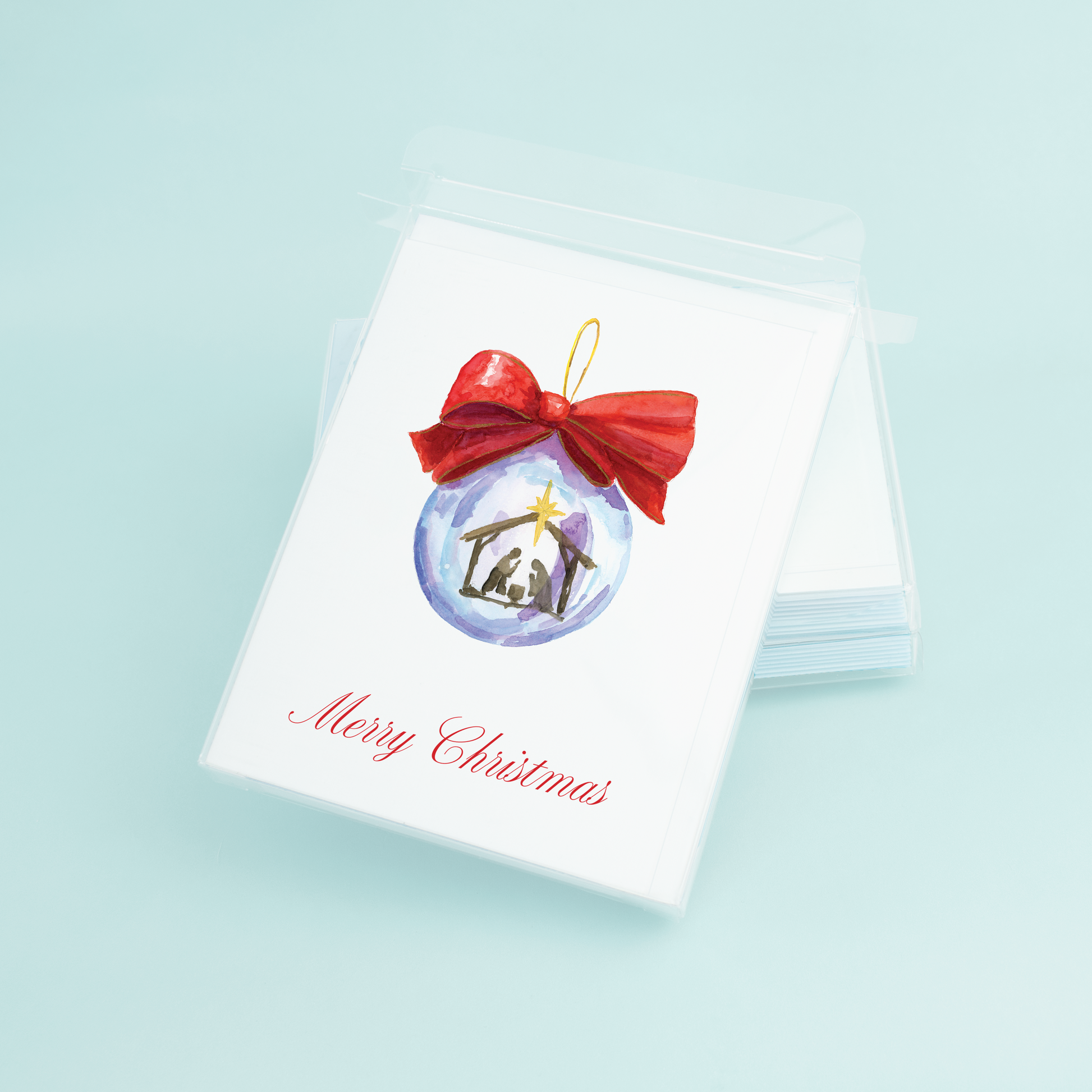 The A2 greeting card is the epitome of sophistication and elegance, showcasing an original watercolor design by Dallas-based artist Taylor Paladino. The design features a beautiful nativity scene nestled inside a festive Christmas ornament, making it the perfect choice for sending warm holiday wishes to friends and loved ones.