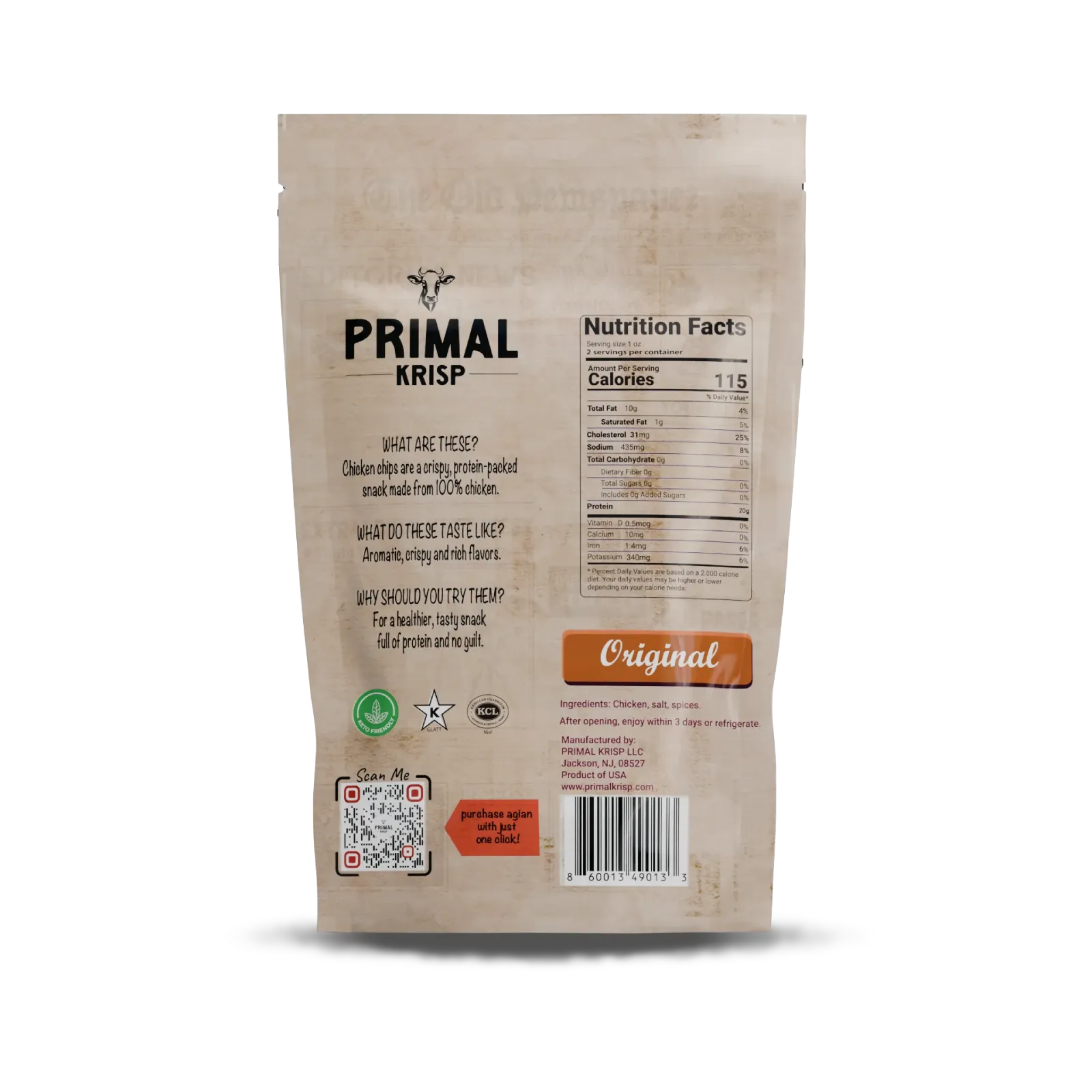 Made from real chicken, Chicken: Original chips offer a savory, protein-packed alternative to traditional snacks. Free from additives and sugar, they deliver pure, natural goodness in every bite.