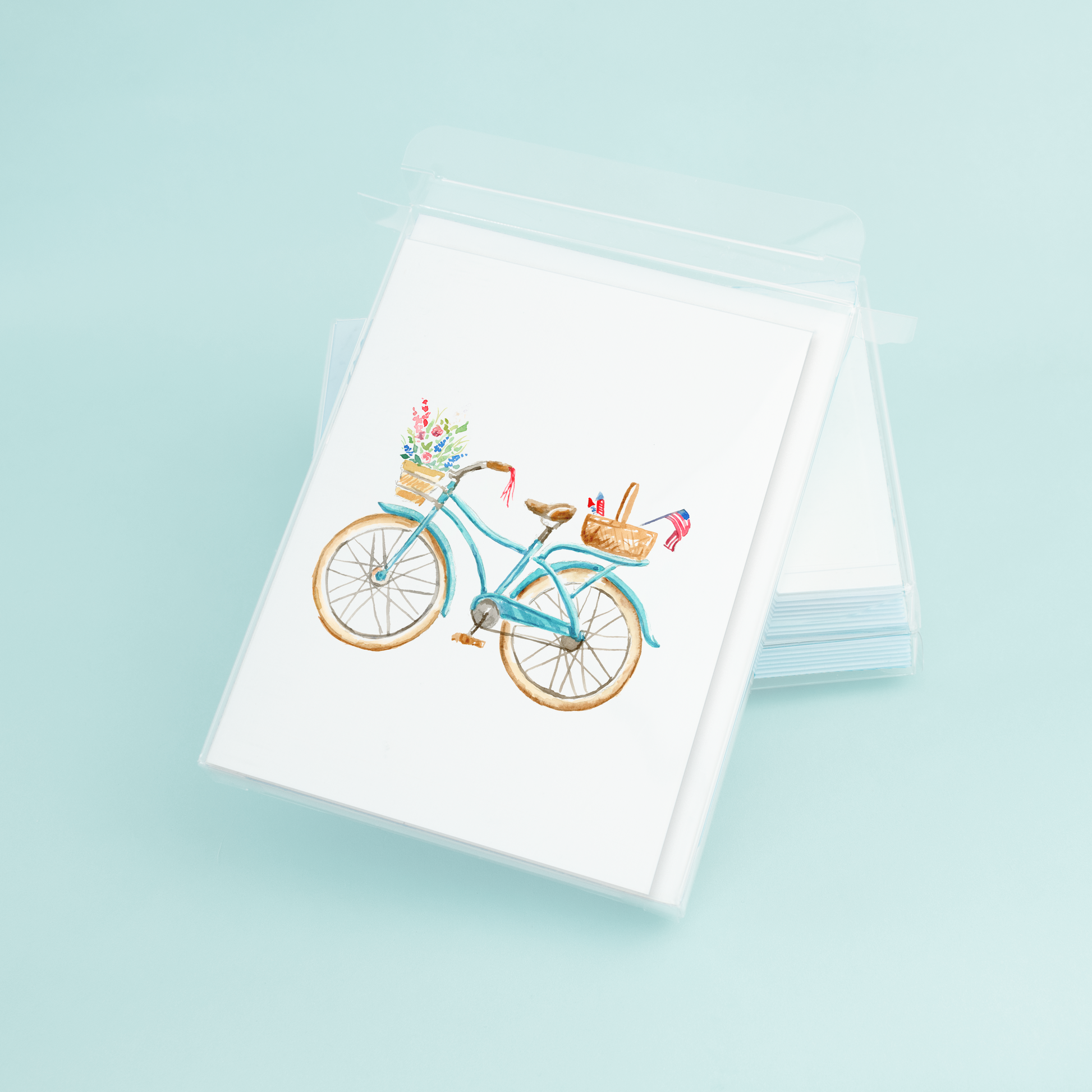 Introducing the A2 greeting card featuring an original watercolor design by Dallas-based artist Taylor Paladino. This card boasts a beautifully painted patriotic bike with vibrant wildflowers in the handlebar's basket, an American flag, and fireworks in the basket on the back, capturing the spirit of American patriotism and freedom.