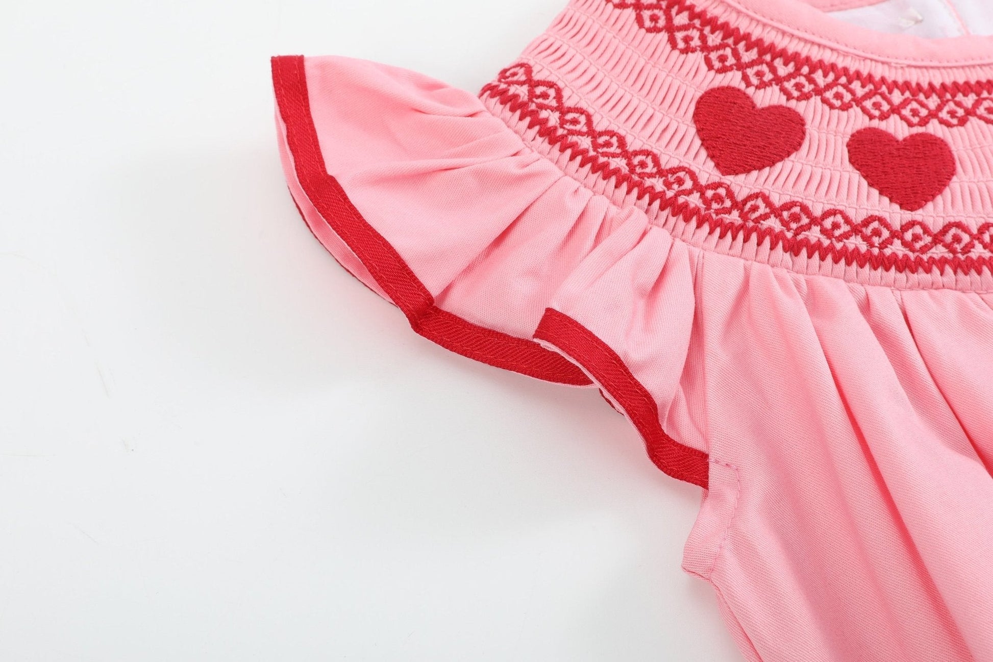 Celebrate love in the sweetest way with our Pink Hearts Valentine Smocked Romper! Made from 100% soft cotton, this adorable one-piece features classic pink gingham and delicate smocking around the neckline, beautifully embroidered with pretty hearts. Snaps at the crotch ensure easy diaper changes, making it as practical as it is precious. Perfect for Valentine’s Day or showing love year-round, this romper is a must-have for your little sweetheart’s wardrobe.