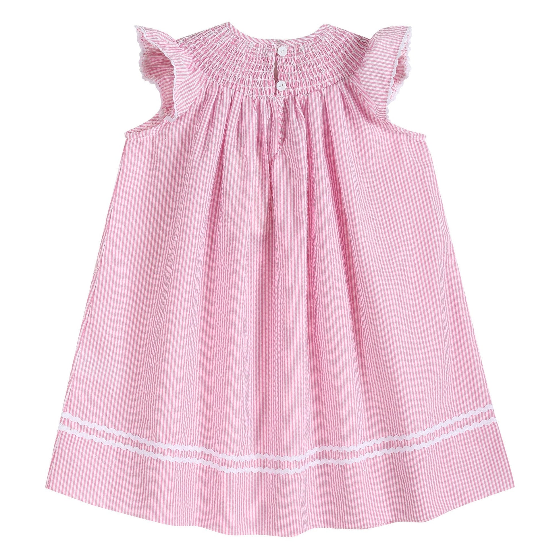 Pink Seersucker Running Bunnies Smocked Bishop Dress