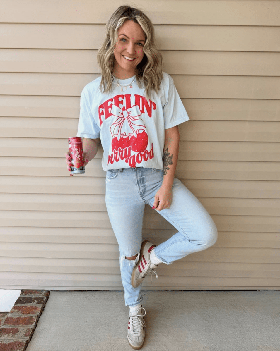 Pair it with denim cutoffs, biker shorts, or your fave lounge pants for an easy, trendy look. Whether you're heading to brunch, the farmer’s market, or just vibing—this tee is serving sweet meets stylish all season long! 🍓✨