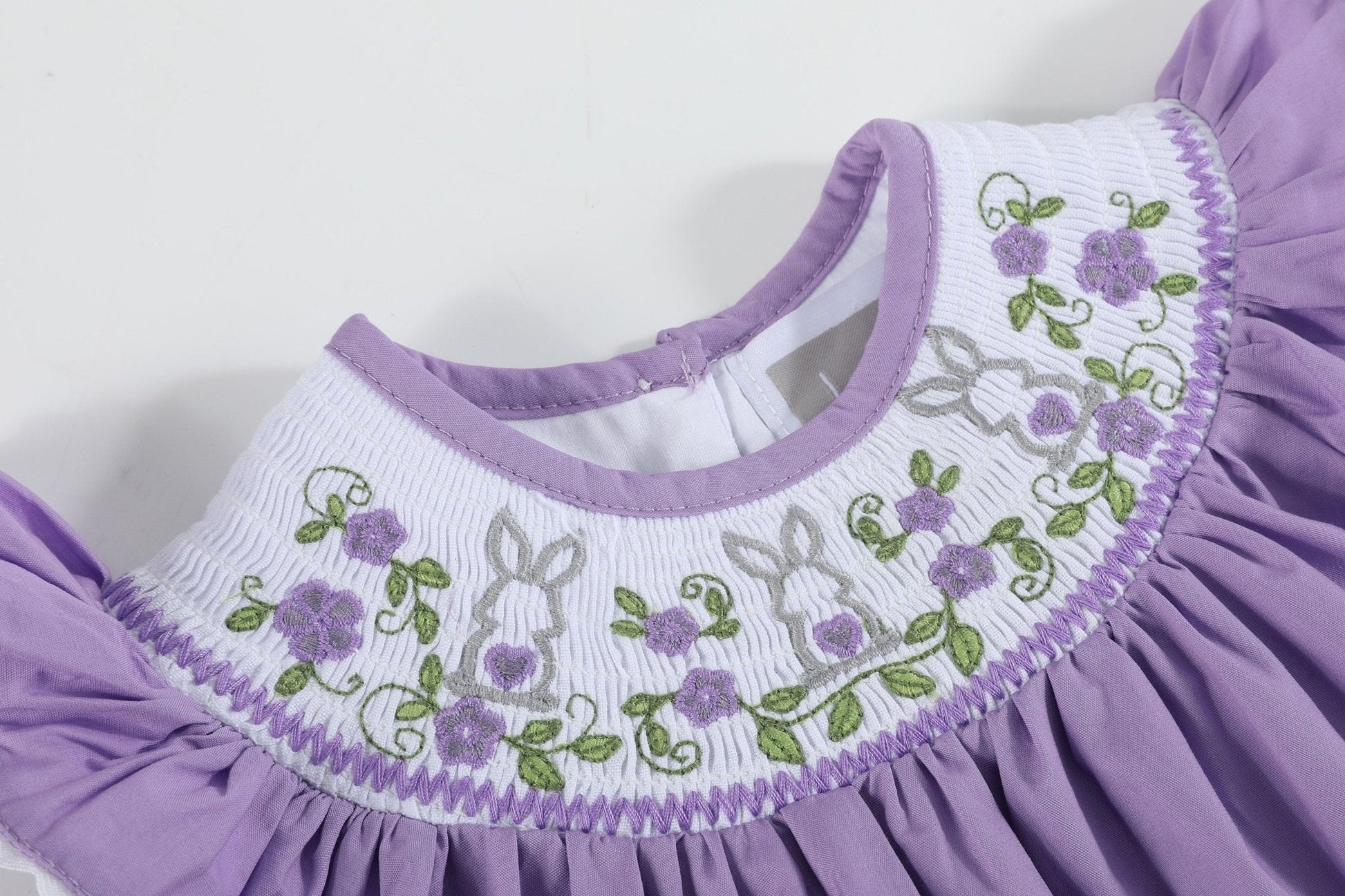 The Purple Easter Bunny Smocked Flutter Romper is an absolute delight for your little girl this Easter season! Made from 100% cotton in a lovely purple hue, it’s as comfortable as it is charming. The smocked neckline is beautifully adorned with embroidered bunnies, vines, and flowers, capturing the spirit of springtime. Delicate rickrack trim adds a whimsical touch, making this romper perfect for Easter egg hunts, family photos, or church celebrations. She’ll be "hoppy" and picture-perfect all day!