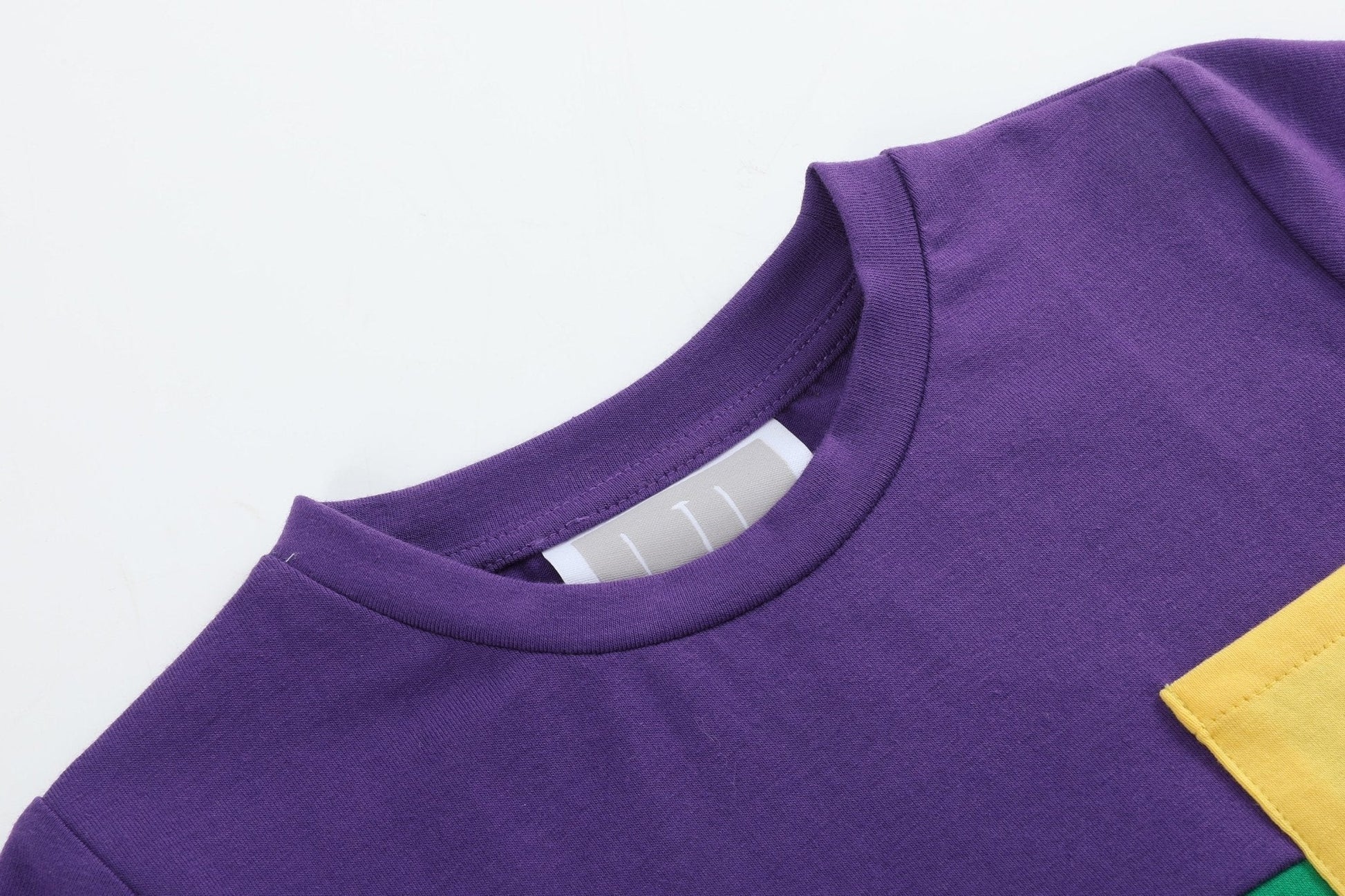 Let him join the Mardi Gras fun in style with our Purple, Green and Gold Shirt and Shorts Set! This playful outfit features a soft cotton top with bold color blocking in green and purple, finished with a cheerful yellow pocket for an extra pop of festive flair. Paired with coordinating shorts, this set is perfect for parades, parties, and all the fun that comes with the season. Comfy, colorful, and full of personality—just right for your little reveler!