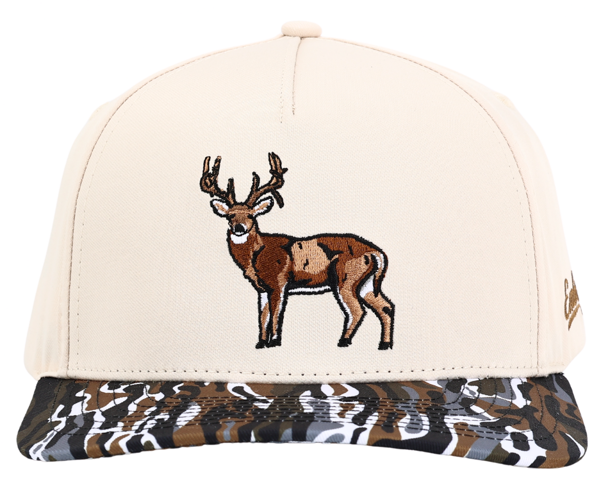 A 6-panel trucker high-profile hat that features our brand new "Ranch" camo on the bill, all around cream panels, and our "Buck" design!