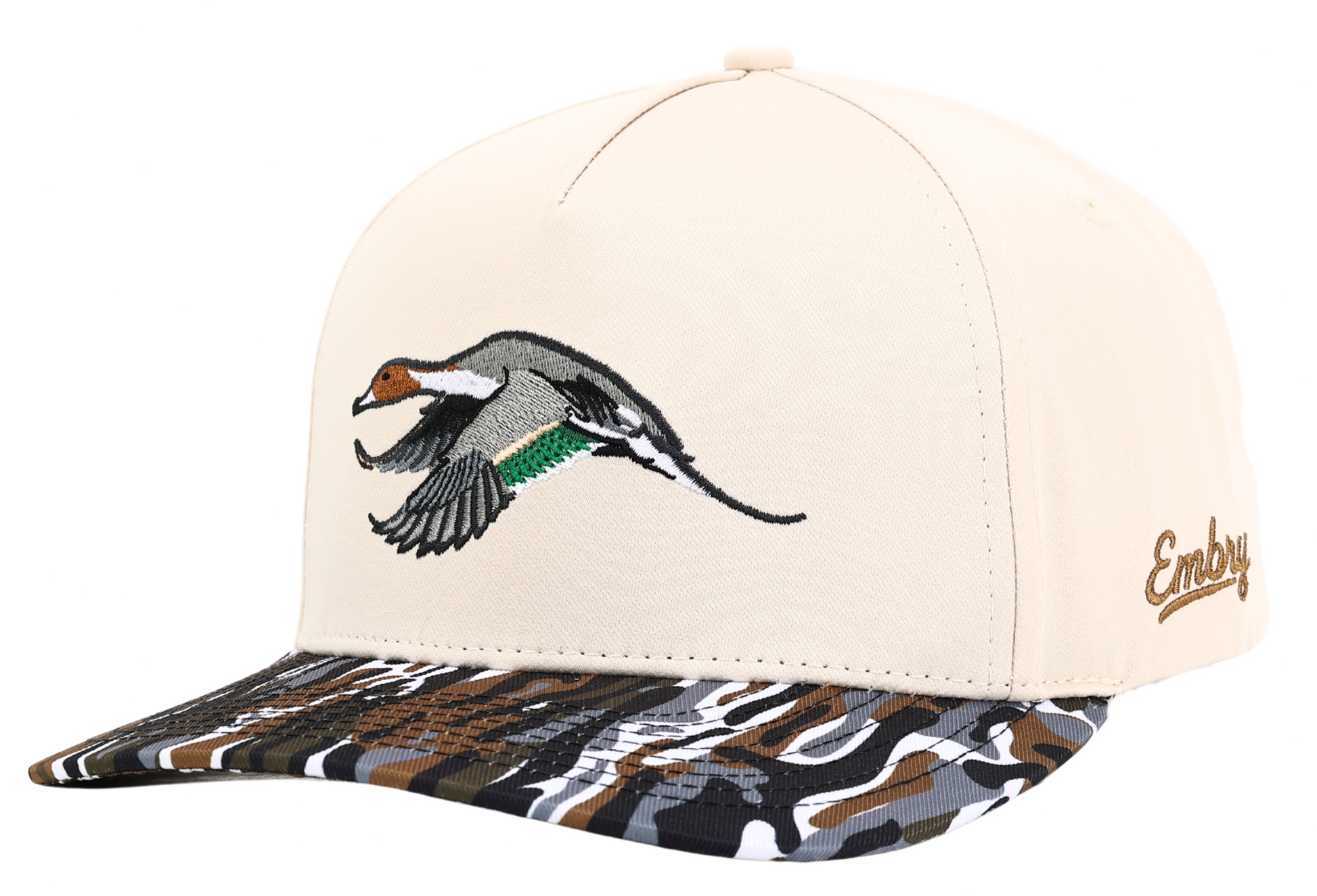 A 6-panel trucker high-profile hat that features our brand new "Ranch" camo on the bill, all around cream panels, and our "Pintail" design!
