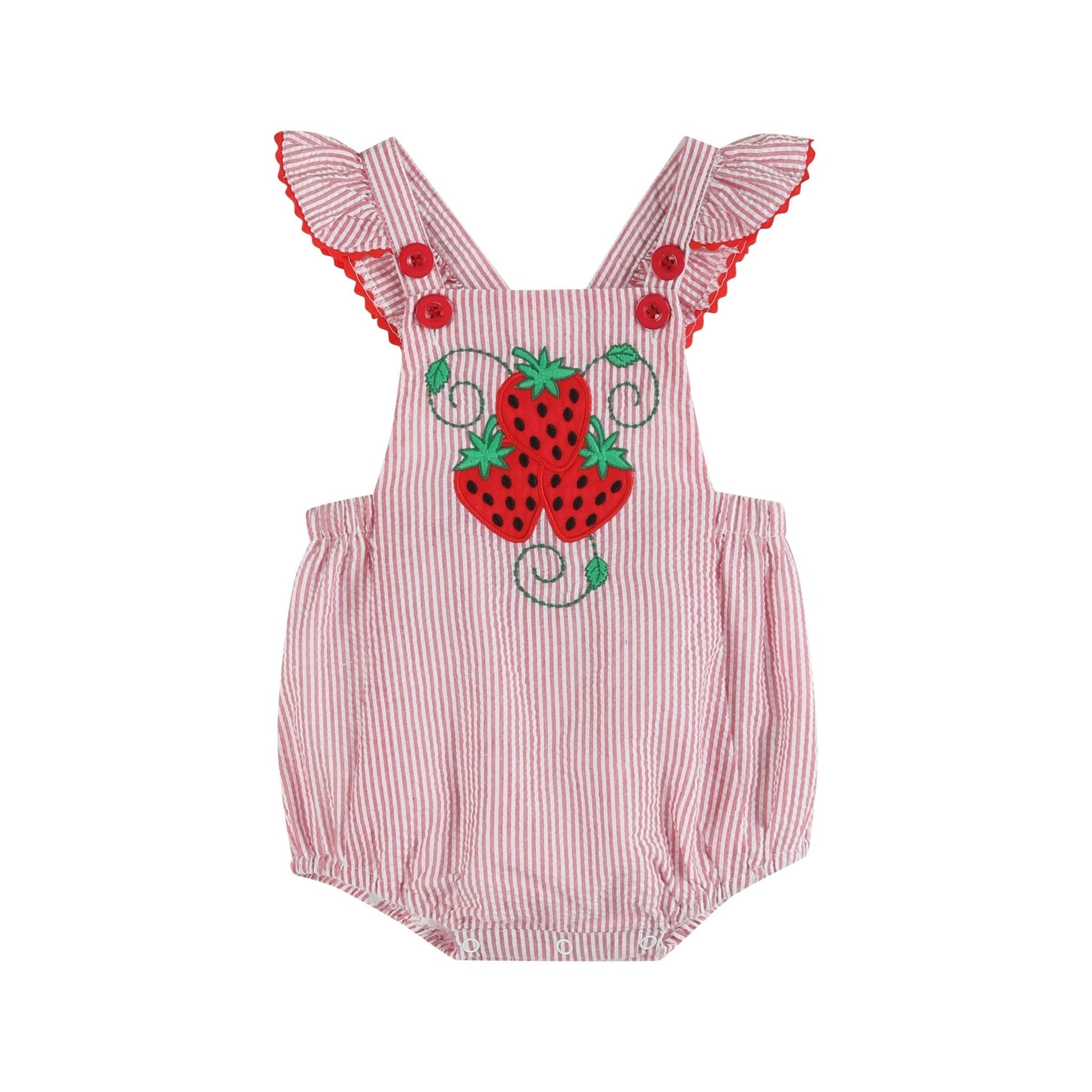 This Red Seersucker Strawberry Ruffle Romper is a sweet little treat for your little sweetie. Detailed with flutter sleeves, bow on the back and intricate strawberry appliqué will make your baby stand out in style! Vibrant buttons at the shoulder allow for size adjustments and snaps on the crotch for easy diaper changes.