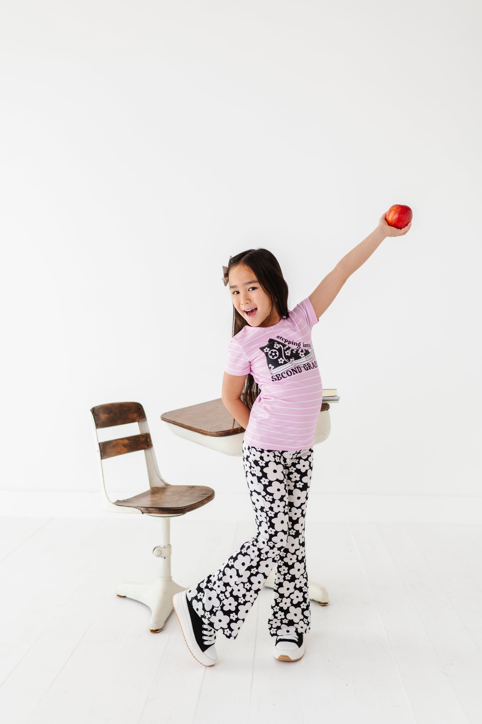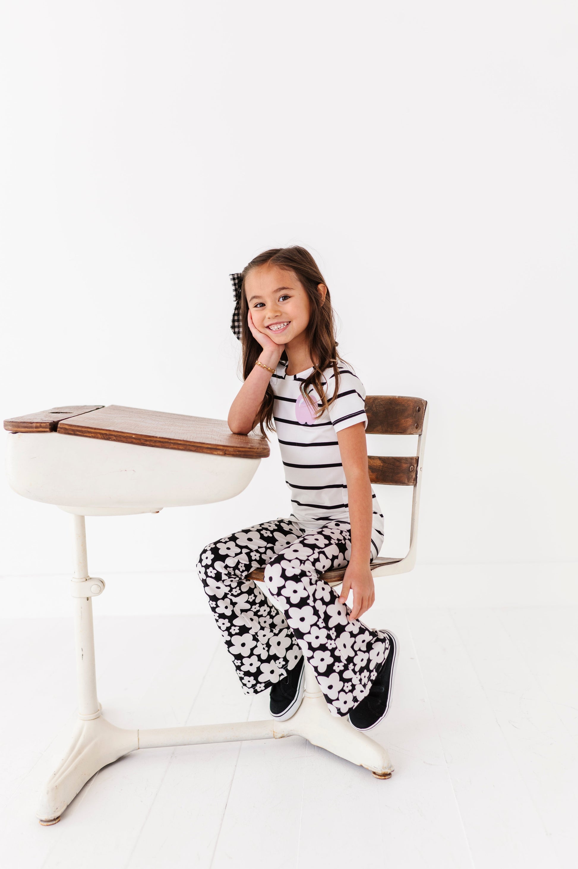 SIZING: Our customers typically find that this style runs TRUE TO SIZE and is intended to fit mid to high waisted with a snug fit in the waist and hips. WE CAUTION AGAINST SIZING UP IN THESE FLARES- THEY COULD BE TOO LONG IF YOU ARE SIZING UP FOR LONGER WEAR! All of our models in the listing pictures are wearing their true size (6T) and normally wear between 6/7 clothes.