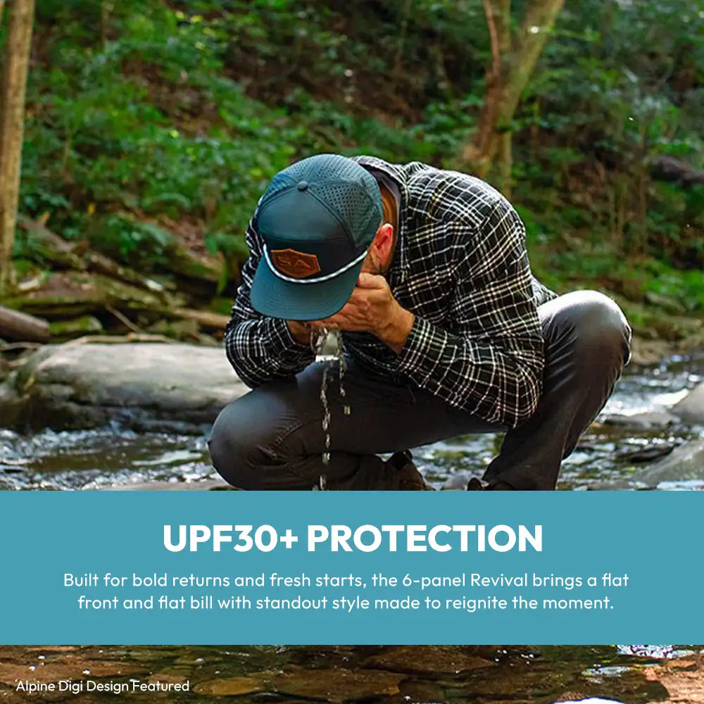 Built for bold returns and fresh starts, the 6-panel Revival brings a flat front and flat bill with standout style made to reignite the moment. Water-repellent, laser-perforated sides, and a moisture-wicking sweatband keep you cool, dry, and moving freely.