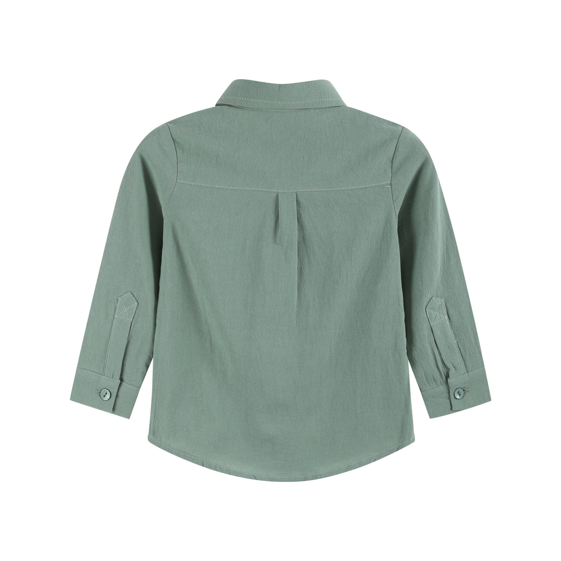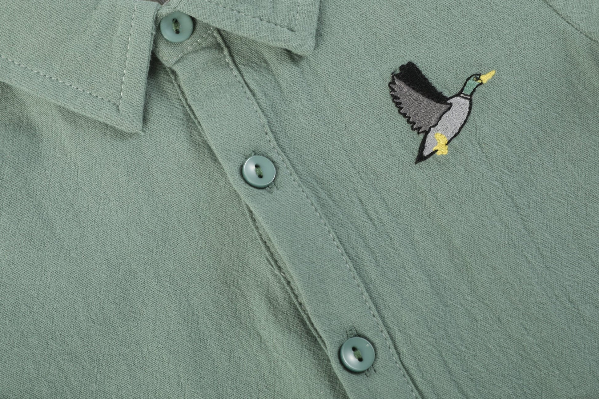 Dress your little guy in dapper style with our Long Sleeve Button-Up Shirt. This charming piece features a cute small mallard embroidered on the chest, adding a playful touch to his ensemble. Classic and adorable, perfect for any occasion!