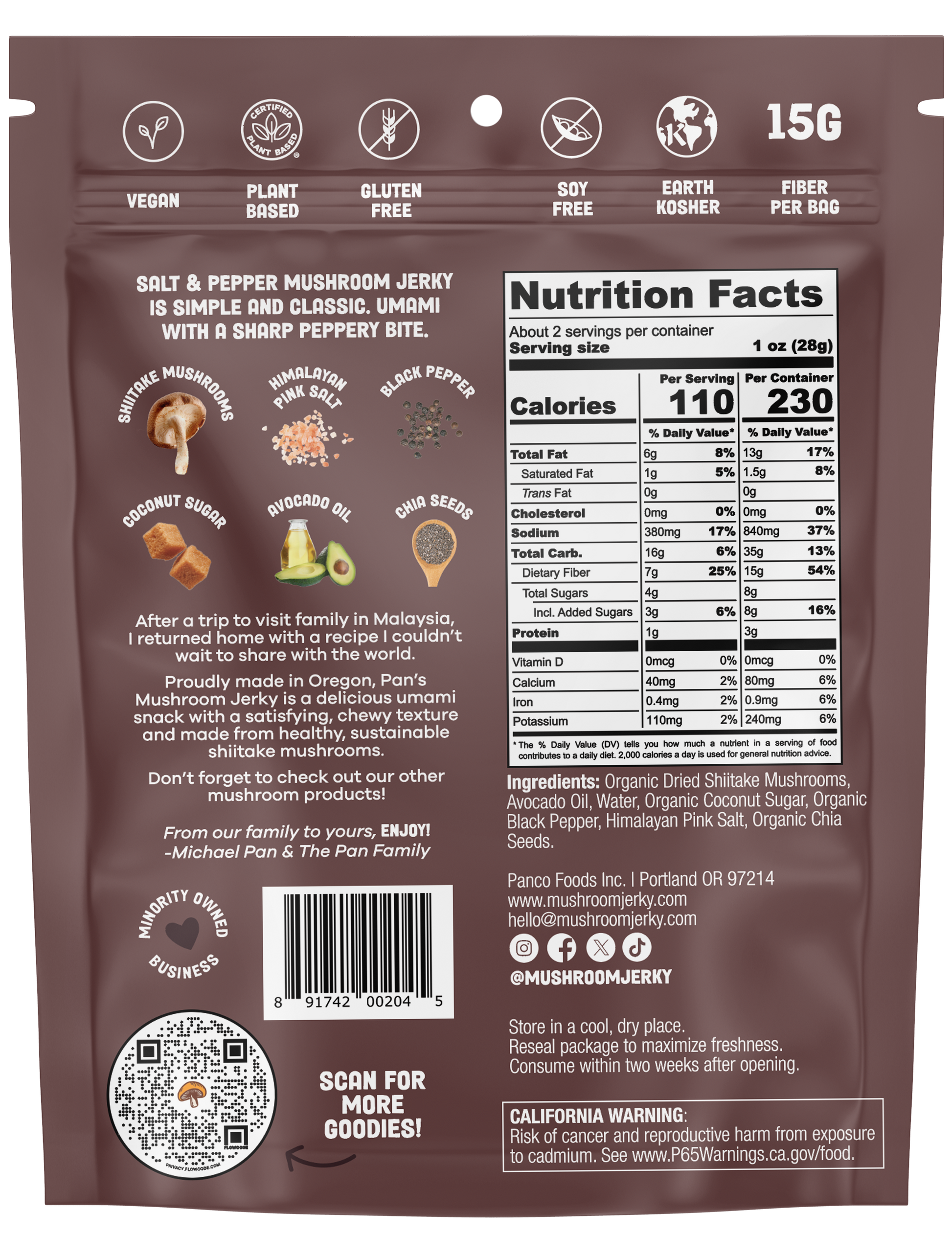 Pan's Salt & Pepper Mushroom Jerky is simple and classic. Umami with a sharp peppery bite.