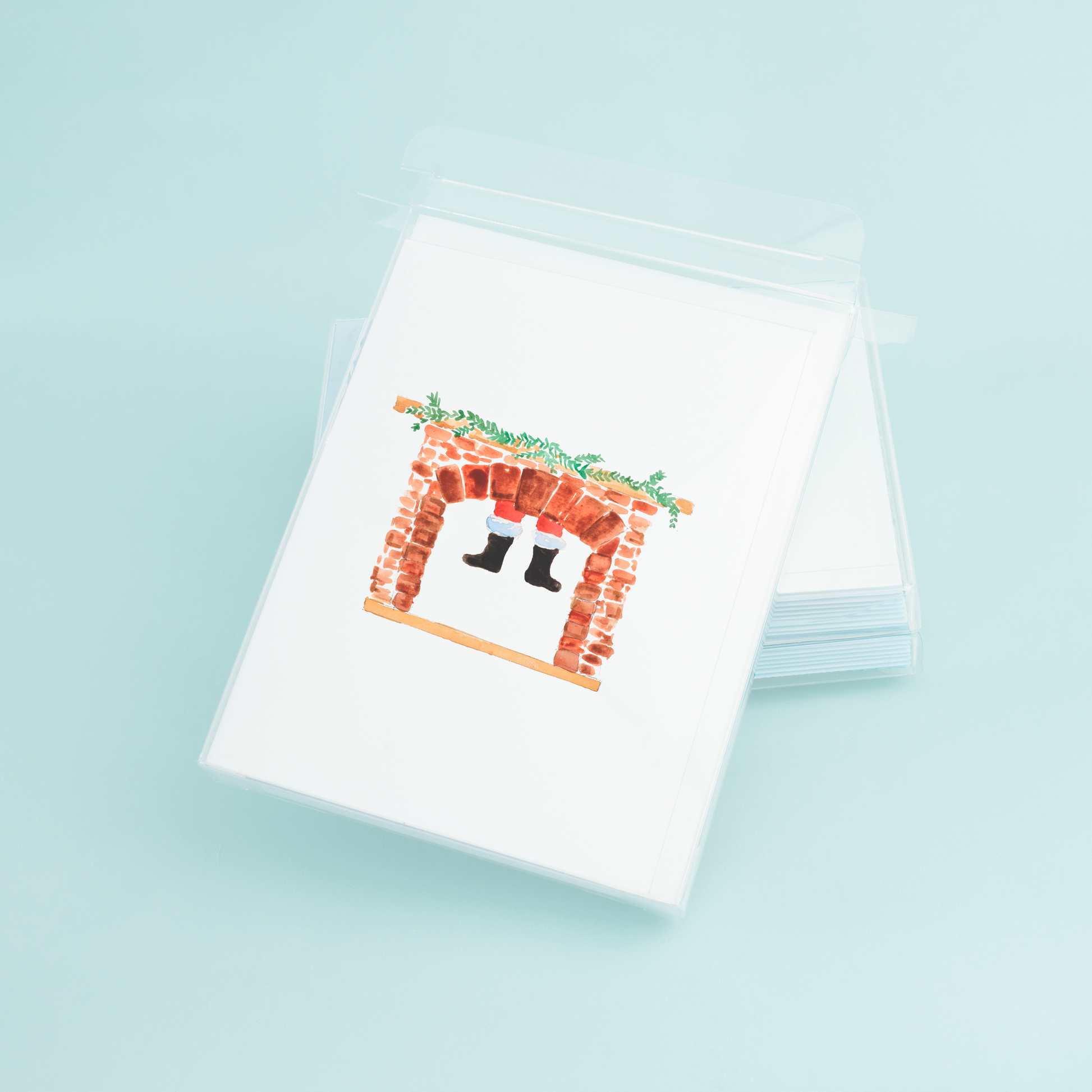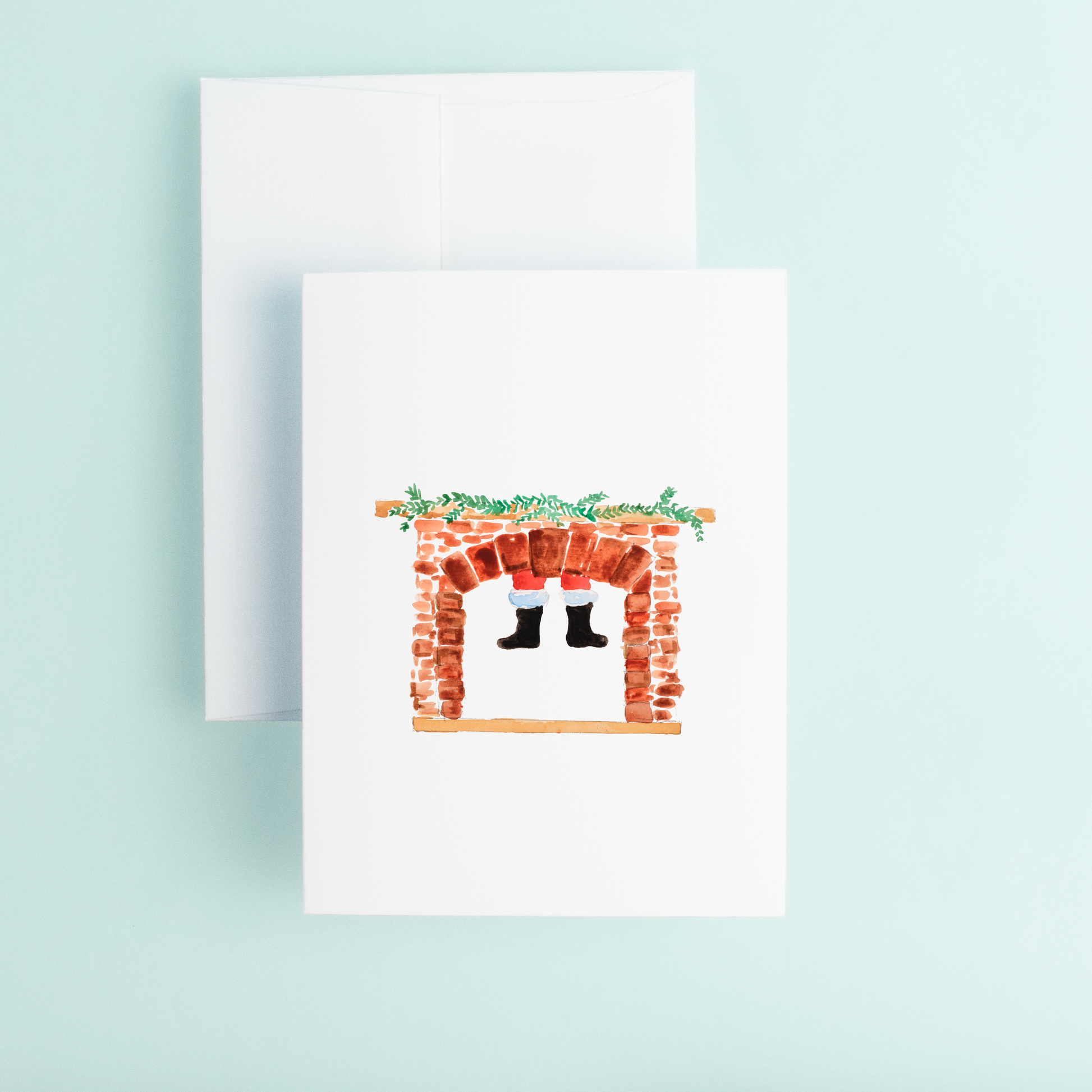 Looking for a unique and eco-friendly way to send your holiday greetings? Look no further than this A2 linen greeting card featuring an original watercolor design by Dallas-based artist Taylor Paladino. The design showcases a detailed scene of Santa's feet hanging down out of a Christmas decorated brick fireplace, bringing the joy and magic of the holiday season right to your recipient's mailbox.
