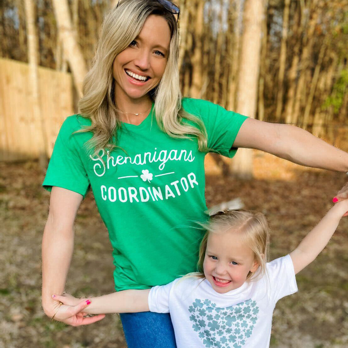 Model is wearing a Small Heather Kelly Green Tee and her daughter is wearing our Shamrock Heart (Kids) tee.