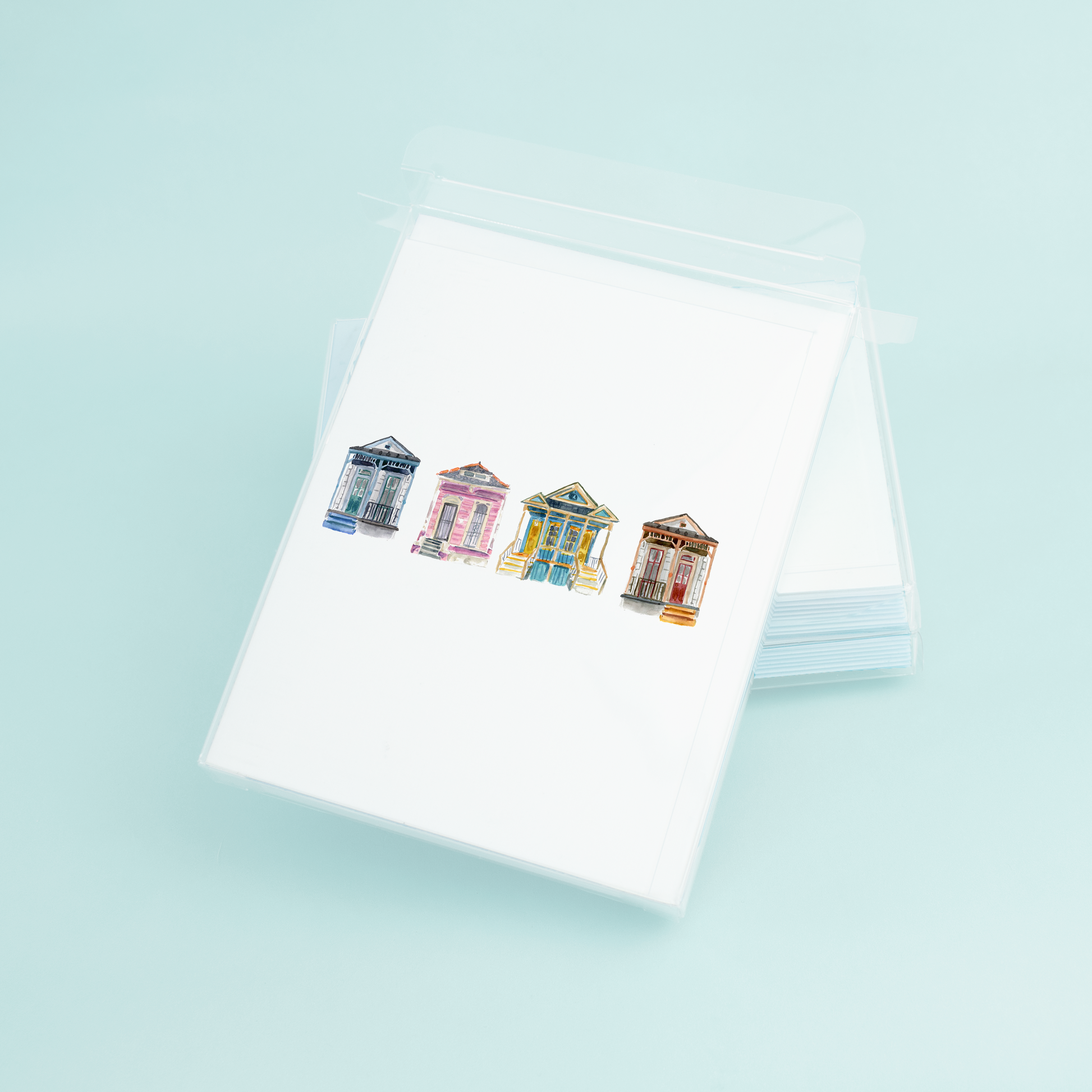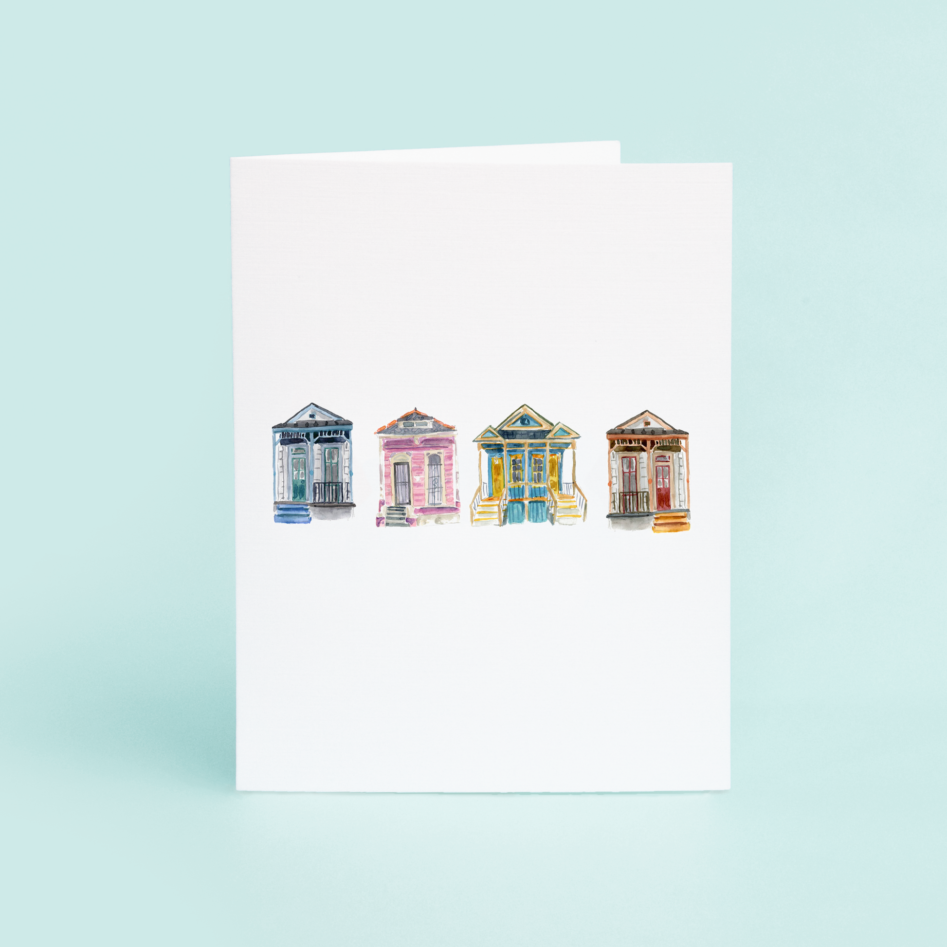 Introducing our new A2 greeting card, featuring a stunning watercolor design by the talented Dallas based artist, Taylor Paladino. The front of the card showcases four intricately detailed shotgun houses, each with its unique character and charm. The vibrant colors and intricate details of the watercolor painting truly capture the essence of the architecture and the unique history of these iconic homes.