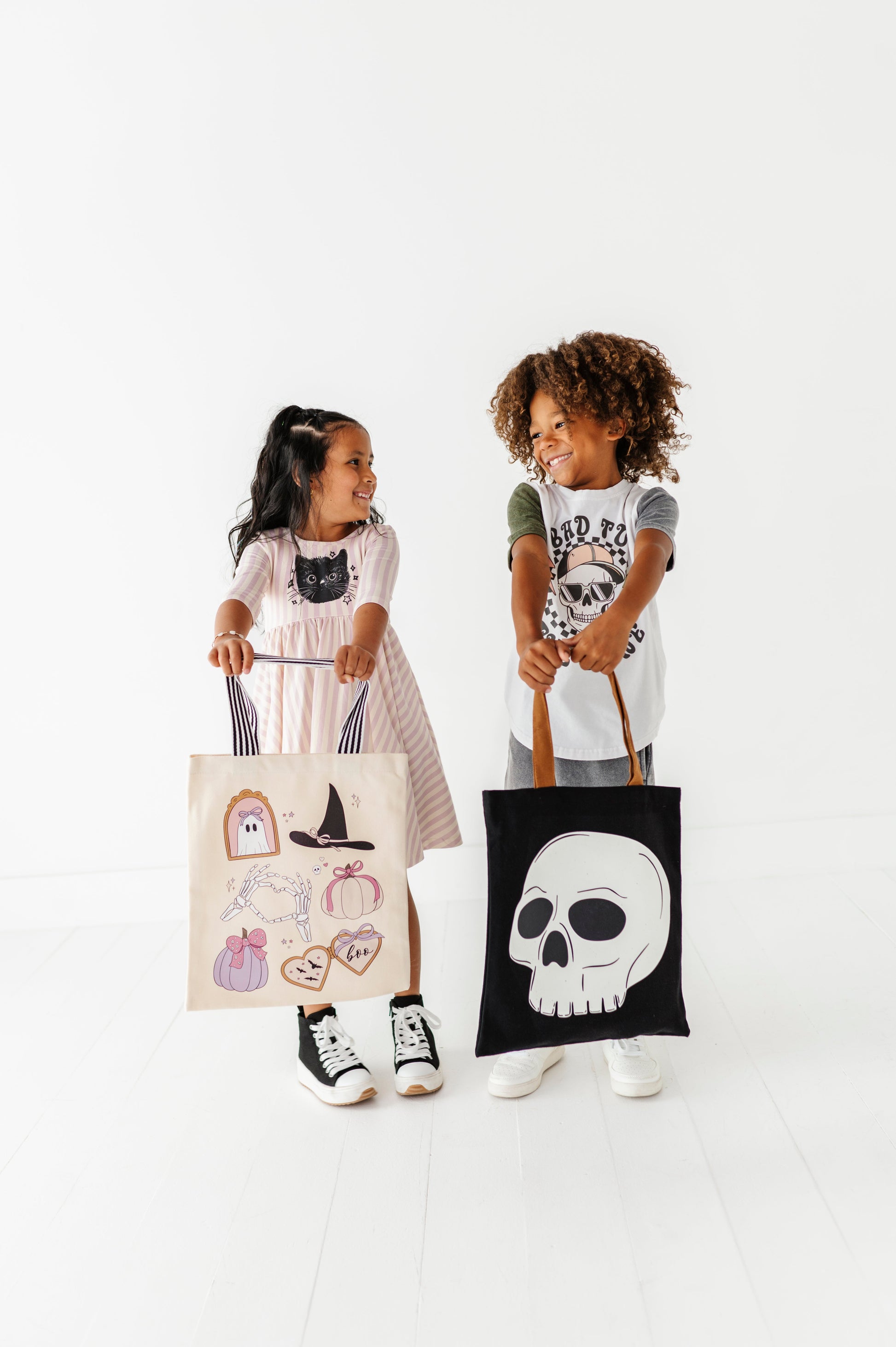 Our NEW and improved trick-or-treat bags are back! These were such a hit last year and are the most fun (and cute) way to trick-or-treat this Halloween! Each bag comes with a sharpie marker to write your child's name on the name tag on the back! This is such a fun activity for your kids to be able to "claim their candy" :) BAGS MEASURE 40X35 CM WITH HANDLES THAT DROP DOWN 10.5''